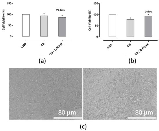 Human dermal fibroblasts (HDFs) and murine fibroblasts (L929) were used as physiologically relevant in vitro models to evaluate the cytotoxicity of the 2D substrates studied. Biocompatibility was evaluated using an indirect cytotoxicity assay with L929 cells, which demonstrated that the CS 2D substrates did not release any cytotoxic components into the conditioned culture media, as no harmful effects on L929 cell proliferation were observed after 24 h of culture. As shown in Figure 14, the materials exhibited good biocompatibility after 24 h of incubation (Figure 14a), further confirmed by microscopic observations that showed normal L929 cell morphology after exposure to CS-conditioned culture media (Figure 14c).