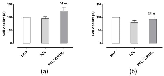 Indirect cytotoxicity test. Alamar Blue assay evaluating (a) L929 and (b) HDF cell viability after exposure to conditioned media from PCL and PCL/Zr-PCHX substrates following 24 h of elution and 24 h of in vitro incubation.