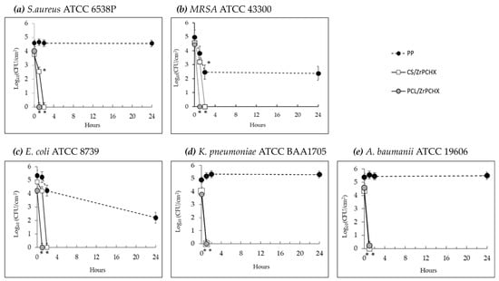 Time-dependent survival of two Gram-positive bacterial strains, (a) S. aureus and (b) MRSA, and three Gram-negative bacterial strains, (c) E. coli, (d) K. pneumoniae, and (e) A. baumanii, on PP (- -•- -) and specimens coated with CS/ZrPCHX (─□─) or PCL/ZrPCHX (─