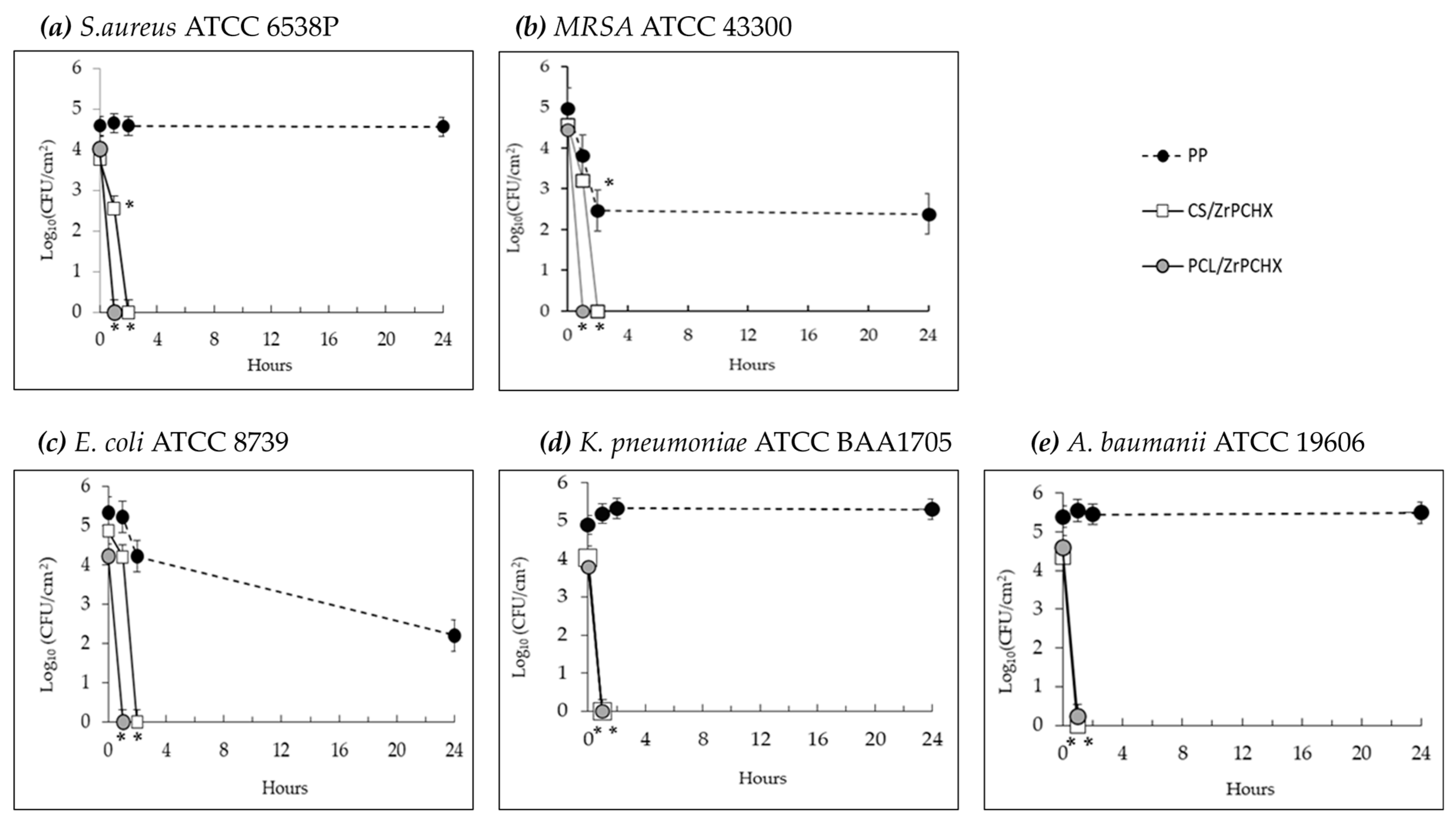─) antibacterial films. Each point indicates the mean number of viable colonies per group of isolates. The number of bacteria was quantified immediately after inoculation and after 1, 2, and 24 h of incubation compared to the control (PP). Mean value of at least 3 experiments ± SD is presented. Differences with respect to controls were defined as statistically significant at p * < 0.01.