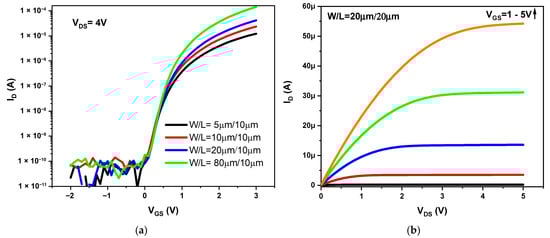 (a) Transfer characteristic in saturation region for a-IGZO TFTs with different channel widths, and (b) output curve for an a-IGZO TFT with (W/L = 20 μm/20 μm).