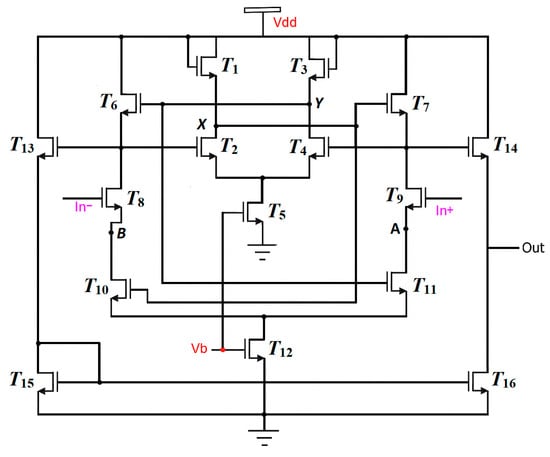 Figure 3 presents the schematic circuit of the designed operational amplifier, composed exclusively of n-type TFTs. The first stage corresponds to a differential pair implemented by transistors T6–T9. This is complemented by a proposed topology to increase transconductance, consisting of transistors T10 and T11, whose gates are connected to the positive feedback network integrated by T1–T4. Transistors T5 and T6 act as bias current sources for the positive feedback network and for the differential stage, respectively. The bias voltage Vb was adjusted so that all devices operated in the saturation region. Finally, the second stage, composed of transistors T13–T16, implements a current mirror whose function is to transform the differential signal into a single-ended output.