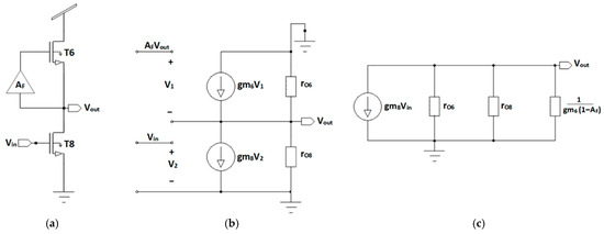 On the other hand, the control voltage of the controlled current source of the driver transistor (T8) is directly the input voltage, V2 = Vin. Since a controlled current source, whose value depends on the voltage between its terminals, can be modeled by a resistor [20], and also considering the direction of the current, the equivalent circuit shown in Figure 4c is obtained. As can be seen, the resulting circuit is formed by three resistors in parallel together with the current source. Applying Ohm’s law, the expression for the small-signal voltage gain () of this stage is obtained: