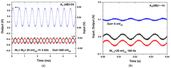 On the other hand, Figure 7b shows the common-mode gain. In this case, two input signals were applied in phase, both of 20 mVpp at a frequency of 100 Hz, obtaining an output signal with a gain of −14 dB. The common mode rejection ratio (CMRR) was calculated as