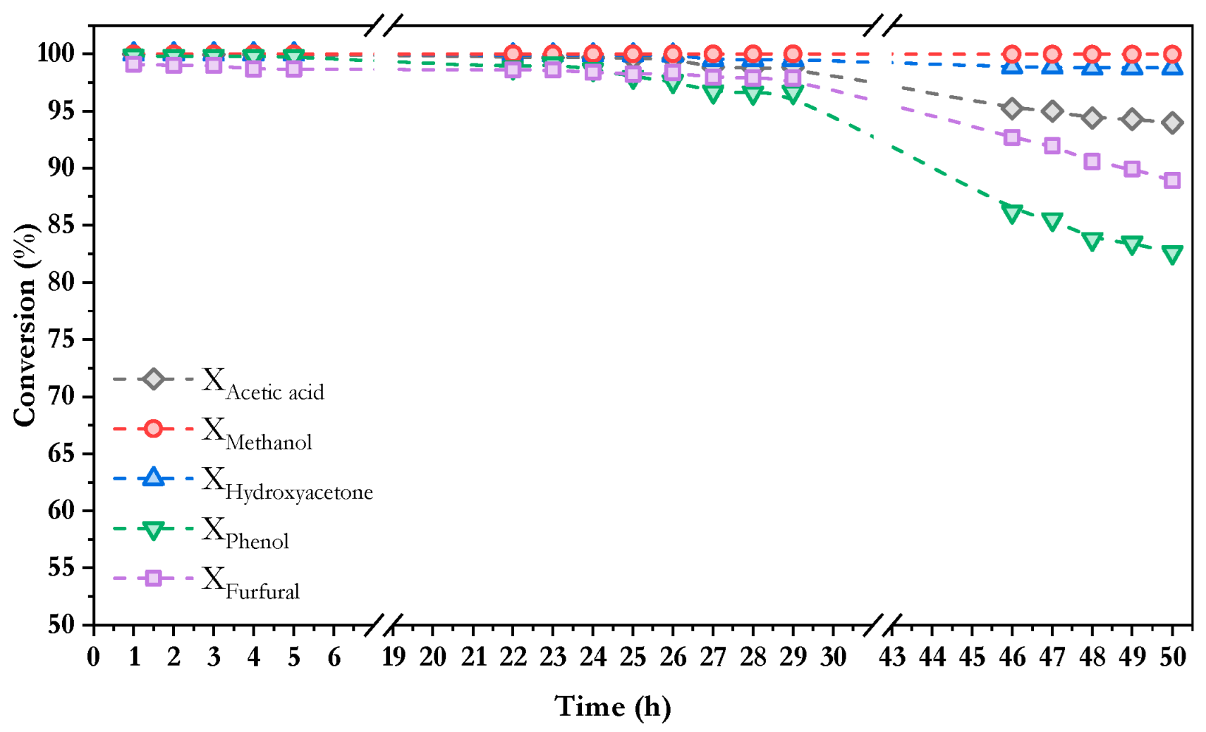 3.3. Oxidative Steam Reforming of Bio-Oil Model Compound Mixtures