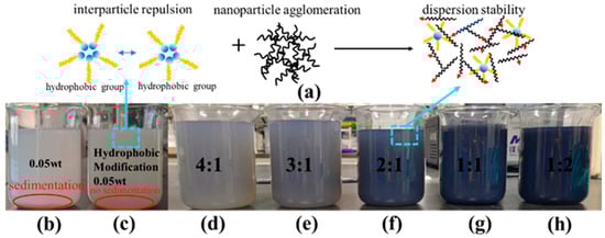 TiO2 nanofluids before and after modification and stability testing of composite nanofluids: (a) mechanism diagram of composite nanofluid; (b) TiO2 nanofluid; (c) hydrophobically modified TiO2 nanofluid; (d–h) 4:1–1:2 composite nanofluid.