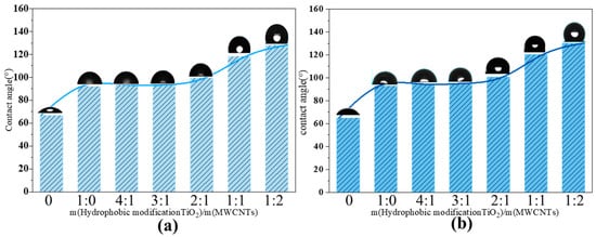 The test was conducted using a contact angle measuring instrument produced by the German company Dataphysics (model: OCA 20; Dataphysics, Filderstadt, Germany). Contact angle testing can evaluate the hydrophobic modification effect of nanofluids. Triplicate measurements were conducted for each sample, and the corresponding average values are presented in the figure. When TiO2@MWCNT composite nanofluids with different proportions but a total concentration of 0.05% were dropped onto a smooth copper substrate, the resulting changes in the contact angle are shown in Figure 5. Before and after boiling, the contact angle remained essentially constant, indicating that there were no instability issues, such as aggregation or detachment of the nanophase, in this system. As the MWCNT ratio increased, the static contact angle of the composite nanofluid correspondingly increased. The modified TiO2@MWCNT composite nanofluid (4:1) exhibited a contact angle of 128.3°, representing an improvement of 36.1° over the modified TiO2 nanofluid. Based on the Cassie–Baxter model [41], the synergistic interplay between surface roughness and low surface energy can further enhance hydrophobicity. Modified TiO2 nanoparticles serve as a low-surface-energy hydrophobic matrix, whereas the porous network structure of MWCNTs increases surface roughness. This synergistic combination augments the hydrophobicity of the nanofluid and concurrently lowers the Gibbs free energy required for bubble nucleation, thereby reducing the boiling point of the hydrophobic nanofluid.