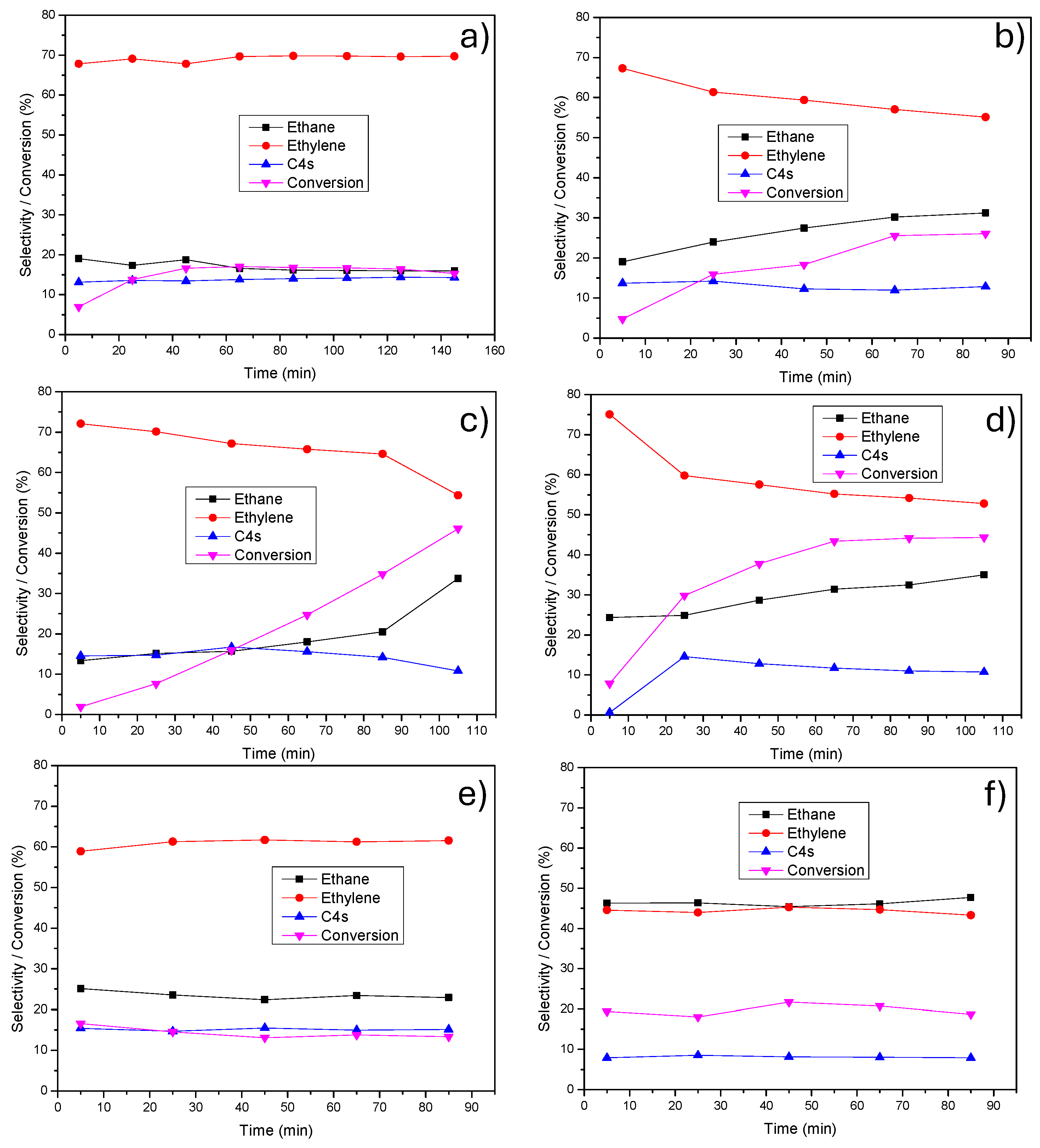 | Catalyst | Activity (μmol/gcat∙s) | Ethane Selectivity (%) | Ethylene Selectivity (%) | C4s Selectivity (%) | Carbon Balance (%) |