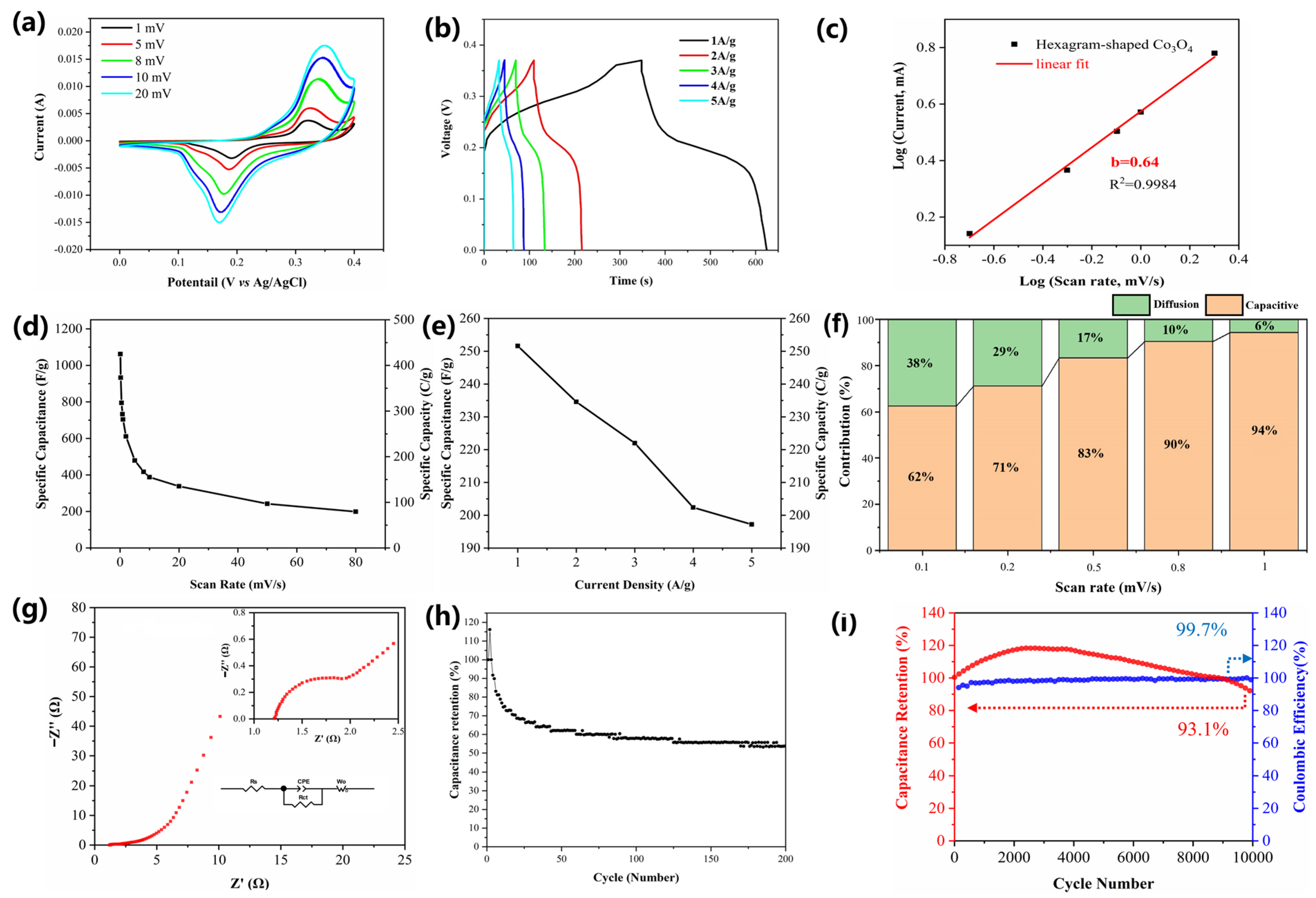 | Hexagram Co3O4 | 1062 F g−1 | 93.1% retention at 10,000 cycles | |
