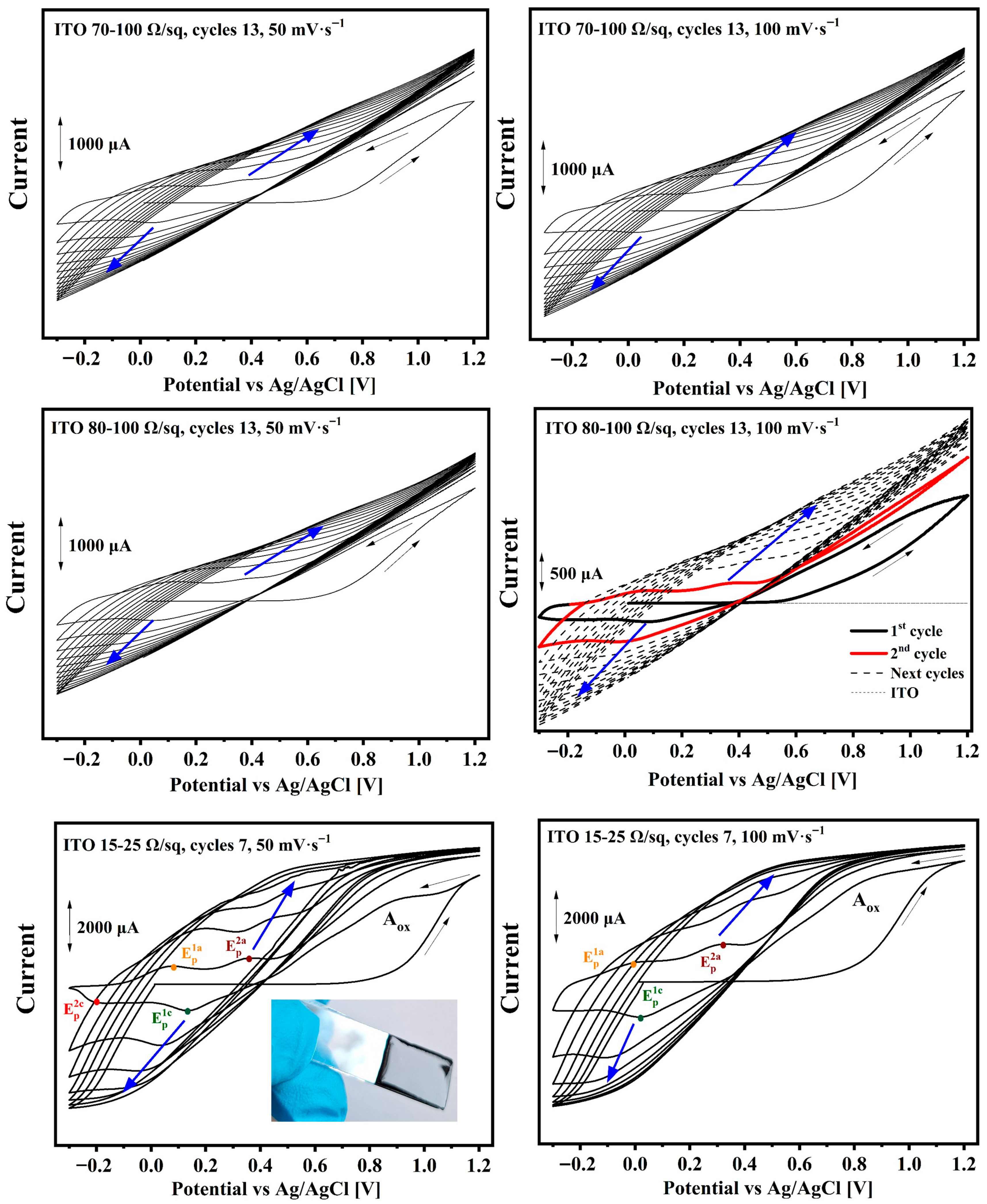 - Leon-Silva, U.; Nicho, M.E.; Hu, H.; Cruz-Silva, R. Effect of modified ITO substrate on electrochromic properties of polyaniline films. Sol. Energy Mater. Sol. Cells 2007, 91, 1444–1448. [Google Scholar] [CrossRef]