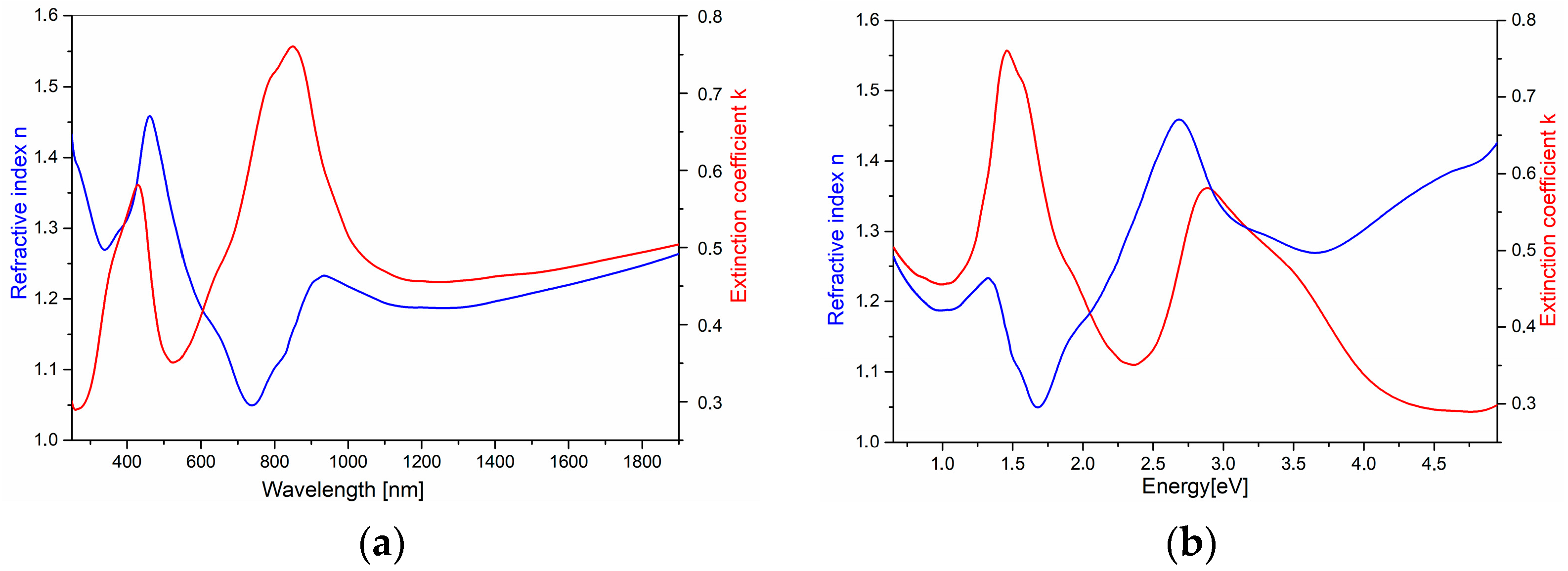 - Dang, M.; Yongyao, L.; Kecheng, G.; Guiping, Z.; Renkuan, Y. Ellipsometric Spectra and Refractive Index of Polyaniline. Chin. Phys. Lett. 1993, 10, 374. [Google Scholar] [CrossRef]