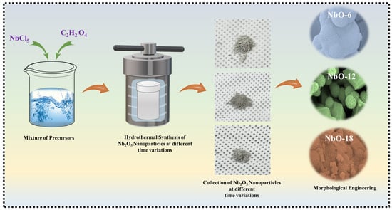 Nb2O5 powders were synthesized via a hydrothermal method. First, 0.02 M NbCl5 was dissolved in 40 mL of DI water and stirred for 10 min. Separately, 0.2 M C2H2O4 was dissolved in 20 mL of DI water and stirred for 10 min. The two solutions were then combined and stirred together for 20 min to obtain a homogeneous precursor solution. The resulting solution was transferred into a 100 mL Teflon-lined stainless-steel autoclave and heated at 180 °C for 6, 12, or 18 h. After naturally cooling to room temperature, the powders were collected by centrifugation, washed several times with DI water and ethanol to remove impurities, and dried at 60 °C overnight. The dried powders were then annealed at 600 °C for 2 h in air to obtain crystalline Nb2O5 with improved structural stability. Figure 1 schematically depicts the stepwise hydrothermal synthesis route adopted in this work, illustrating the controlled formation and evolution of Nb2O5 nanostructures under varied reaction durations.