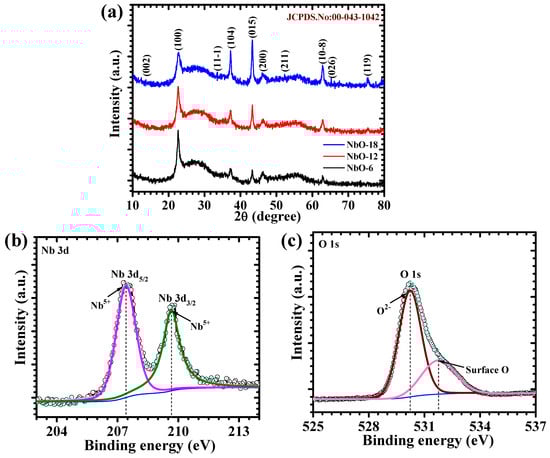 (a) XRD pattern of Nb2O5 electrodes (JCPDS reference card (No. 00-043-1042)); High-resolution XPS spectra of the NbO-12 sample: (b) Nb 3d, and (c) O 1s.