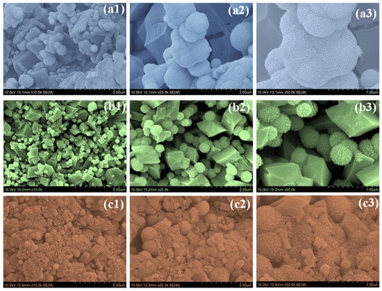 FESEM images of (a1–a3) NbO-6, (b1–b3) NbO-12, and (c1–c3) NbO-18 samples recorded at different magnifications.