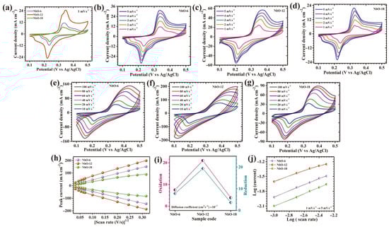 (a) Cyclic voltammetry (CV) curves of all Nb2O5 electrodes at a scan rate of 1 mV s−1 in the potential window of 0–0.5 V; CV curves at different scan rates for (b–d) NbO-6, NbO-12 and NbO-18 at 1–5 mV s−1, (e–g) NbO-6, NbO-12 and NbO-18 at 10–100 mV s−1, (h) peak current vs. (scan rate)1/2 plot; (i) diffusion coefficient calculation; (j) log(i) vs. log(ν) plot.
