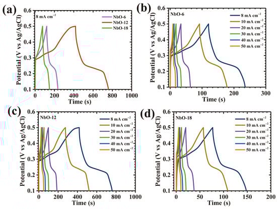 (a) GCD curves of all Nb2O5 electrodes at 8 mA cm−2; GCD profiles at various current densities for (b) NbO-6, (c) NbO-12, and (d) NbO-18 at various scan rates.
