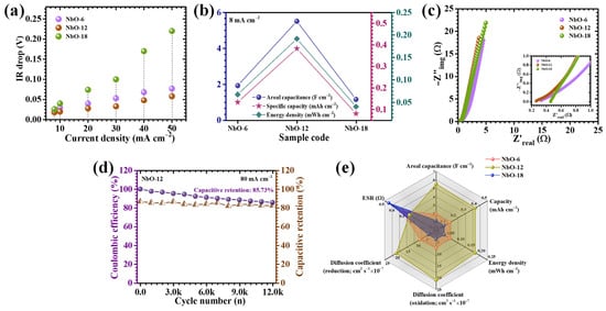(a) IR-drop analysis and comparison of areal capacitance, specific capacity, and energy density for Nb2O5 electrodes; (b) Comprehensive electrochemical performance metrics of Nb2O5 electrodes (c) Nyquist (EIS) plots of the electrodes; (d) long-term cycling stability of the Nb2O5 electrode over 12,000 GCD cycles (e) Radar plot.