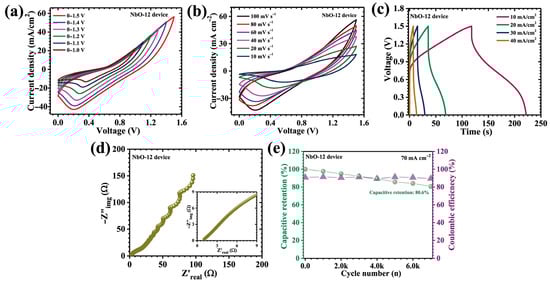 To bridge the gap between fundamental electrode evaluation and practical energy storage application, an asymmetric pouch-type supercapacitor device (APSD) was assembled using the optimized NbO-12 electrode as the positive terminal and activated carbon (AC) as the negative terminal. The selection of AC as the counter electrode is strategically motivated by its excellent electric double-layer capacitance, which complements the diffusion-controlled pseudocapacitive behavior of Nb2O5. This asymmetric configuration enables effective voltage expansion while maintaining balanced charge storage kinetics, thereby enhancing overall device performance. Both electrodes were fabricated on nickel foam current collectors to ensure high electrical conductivity, mechanical robustness, and reliable interfacial contact. For the preparation of the negative electrode, a uniform slurry was formulated by mixing activated carbon with acetylene black as a conductive additive and polyvinylidene fluoride (PVDF) as a binder, using N-methyl-2-pyrrolidone (NMP) as the solvent. The mixture was thoroughly homogenized to achieve uniform dispersion and then evenly coated onto the nickel foam substrate (2 mg cm−2). The coated electrodes were subsequently dried at 60 °C for 12 h to ensure complete solvent evaporation and strong adhesion of the active material layer. The asymmetric pouch cell was assembled using a filter paper separator soaked in 2 M KOH aqueous electrolyte, which simultaneously served as the ionic medium and physical barrier between the electrodes. The device was sealed to prevent electrolyte leakage, evaporation, and atmospheric contamination, thereby ensuring electrochemical stability during extended operation. Electrochemical characterization of the APSD was systematically carried out using CV, GCD, and EIS. The asymmetric device was designed based on the charge balance principle (q+ = q−), where . In this work, equal areal mass loadings were employed for NbO-12 and AC electrodes, and the suitability of this ratio was validated through stable CV/GCD characteristics and cycling performance without signs of electrode over-polarization. All device-level areal electrochemical metrics were calculated based on the geometric device overlap area (i.e., the effective total device area). The NbO-12 electrode demonstrated stable electrochemical operation within a potential window of 0.1–0.5 V (vs. Ag/AgCl), whereas the activated carbon (AC) electrode exhibited reliable capacitive behavior in the range of −1.0 to 0 V. The complementary voltage stability of the two electrodes enabled the NbO-12//AC asymmetric device to operate safely over an extended cell voltage of up to 1.5 V without inducing electrolyte decomposition or electrode instability. To validate the electrochemical robustness of the assembled device, CV measurements were conducted over progressively different voltage windows from 1.0 to 1.5 V, as shown in Figure 10a. The resulting CV curves consistently display well-defined pseudocapacitive features accompanied by stable current responses, confirming the excellent reversibility and structural integrity of the device across the entire operating voltage range. Further, the CV curves of the NbO-12//AC device, recorded over scan rates ranging from 10 to 100 mV s−1 (Figure 10b), exhibit quasi-rectangular profiles accompanied by discernible redox humps. This behavior confirms the coexistence of surface-controlled capacitive charge storage contributed by the AC electrode and diffusion-dominated faradaic reactions originating from the Nb2O5 electrode. Notably, the device operates stably over an extended potential window of 1.5 V, which is relatively wide for an aqueous electrolyte system. This voltage expansion is enabled by the synergistic coupling of the high redox activity of NbO-12 with the large surface area and electrochemical stability of the AC electrode, allowing efficient utilization of both faradaic and non-faradaic storage mechanisms.