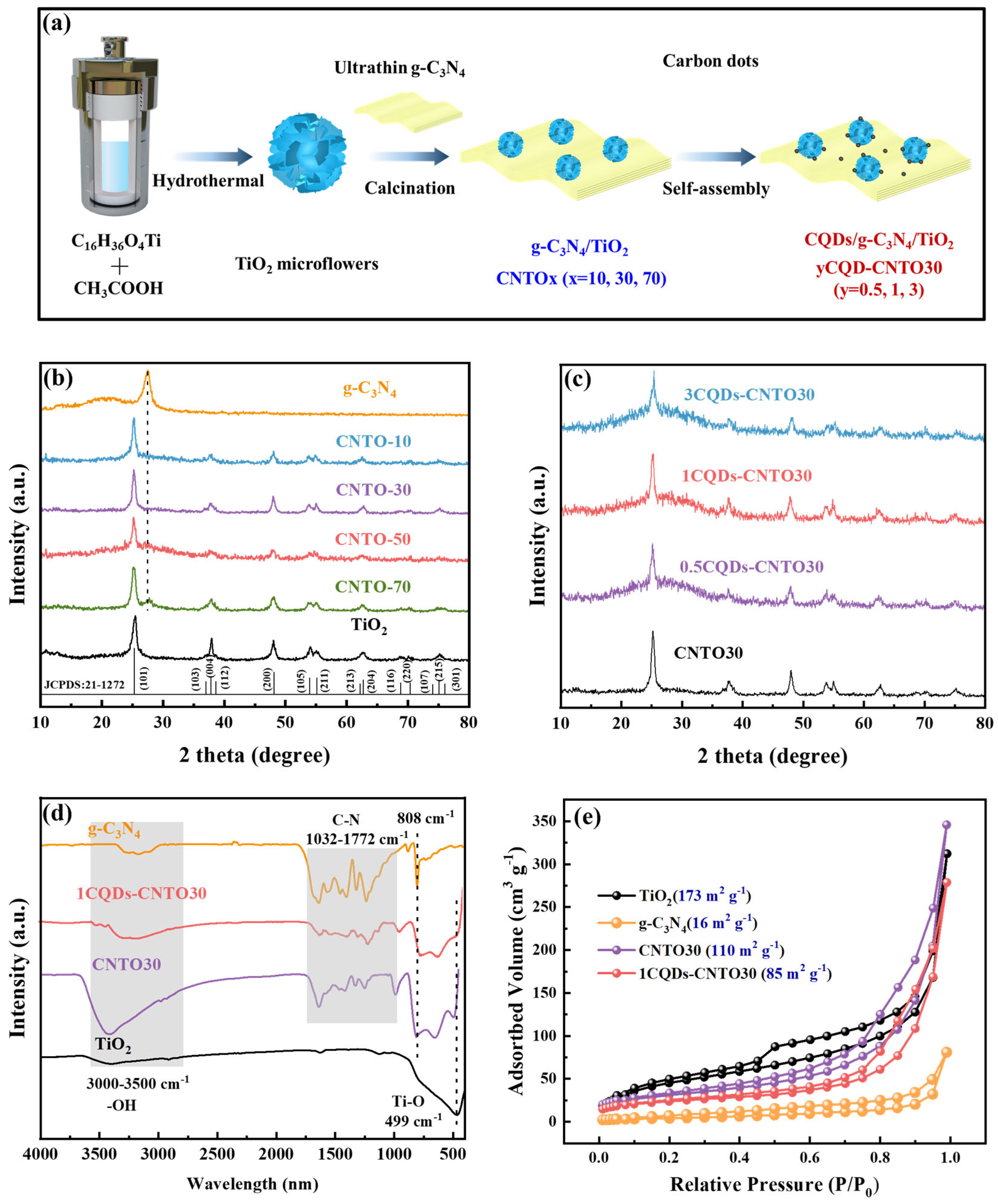 Wang K, Su X, Zhou Z, Hu L, Li H, Long J, Feng Y, Zhang X, Zhang J, Feng J. Dual-Effect of S-Scheme Heterojunction and CQDs Strengthens the Charge Separation and Transfer in CQDs-g-C3N4/TiO2 Photocatalysts Toward Efficient Tetracycline Degradation. Nanomaterials. 2026; 16(3):181. https://doi.org/10.3390/nano16030181