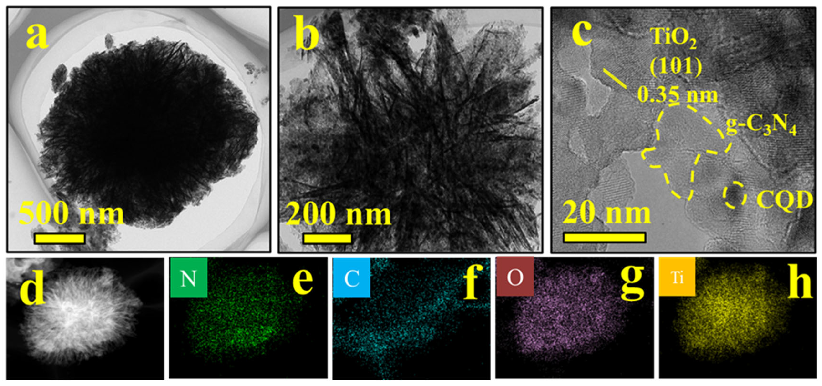 - Xu, C.; Li, D.; Liu, X.; Ma, R.; Sakai, N.; Yang, Y.; Lin, S.; Yang, J.; Pan, H.; Huang, J.; et al. Direct Z-scheme construction of g-C3N4 quantum dots/TiO2 nanoflakes for efficient photocatalysis. Chem. Eng. J. 2022, 430, 132861. [Google Scholar] [CrossRef]
