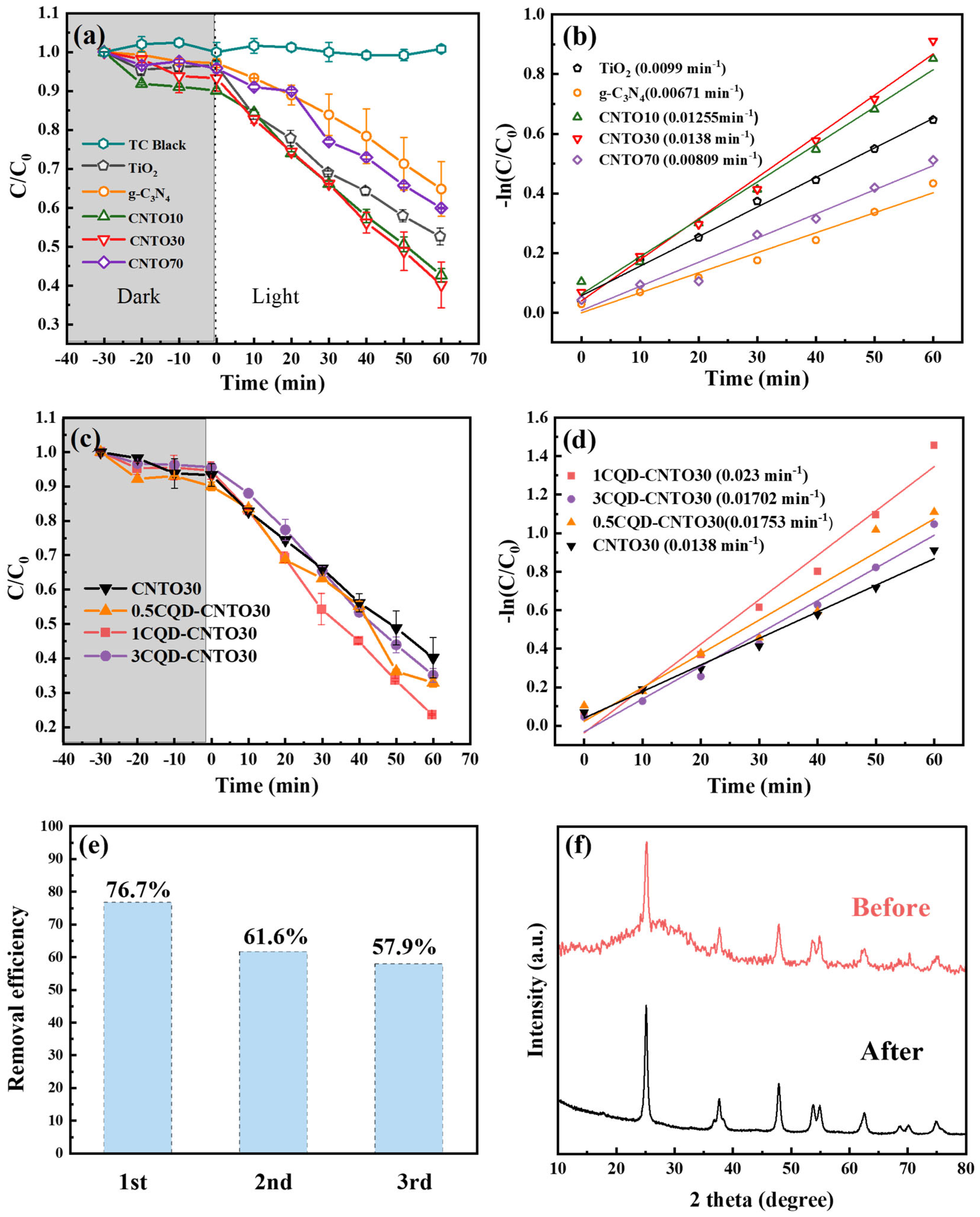 | This work | 1CQDs-CNTO30 | 76.7% 0.0023 | CTC: 50 mg L−1; time: 60 min; mcat: 0.2 g L−1; | 3.2 × 10−3 |