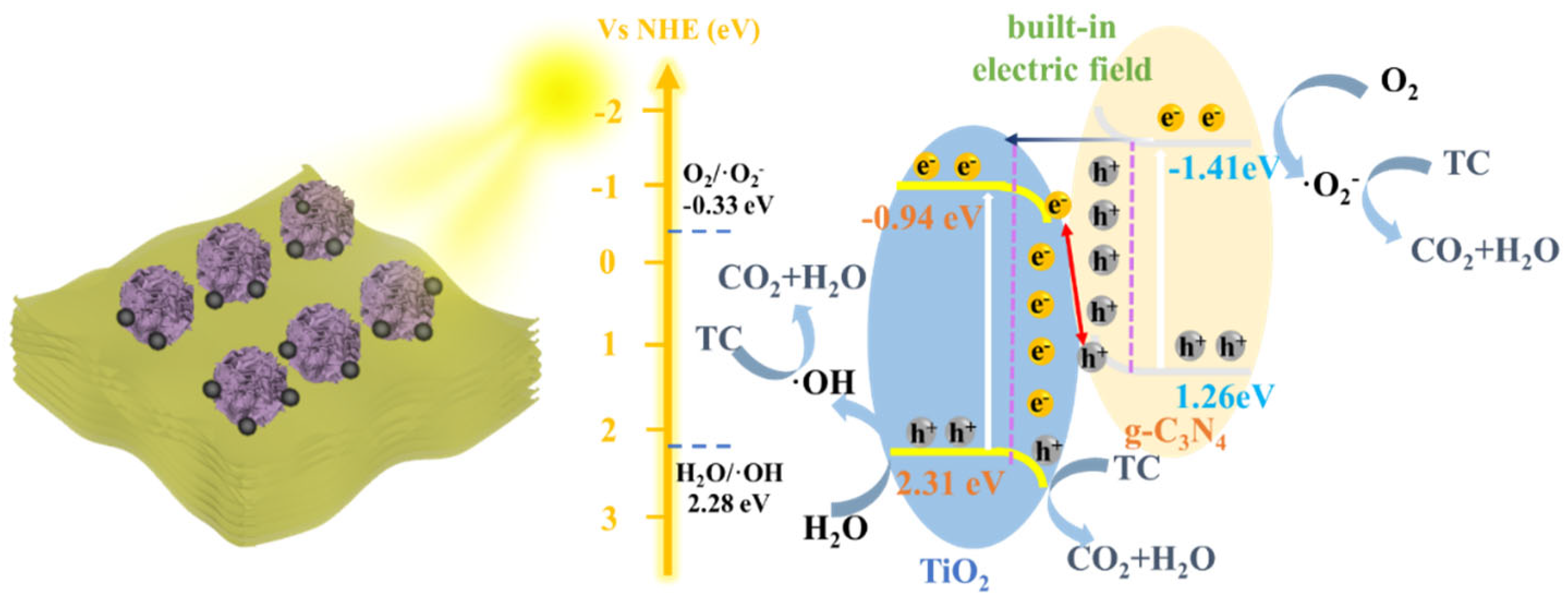 - Shi, Y.; Zhao, R.; Yang, W.; Bu, Q.; Yang, L.; Tang, J. Interface-coupled supramolecular self-assembly 2D Z-scheme TiO2/g-C3N4 heterojunction for efficient degradation of tetracycline under visible light. J. Alloys Compd. 2025, 1018, 179252. [Google Scholar] [CrossRef]