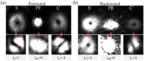 If the fundamental Gaussian optical fields injected into the Cs vapor cell are replaced by vortex beams carrying lℏ OAM (l is the OAM quantum number), the topological charge can also be transferred into the generated FWM beams through multiple phase-matched FWM interactions, which is in accordance with the principle of OAM conservation [9,10]. That is, the rules should be 2lPF = lS + lC for FWMf, lPF + lPB = lS + lS′ for FWMS, lPF + lPB = lC + lC′ for FWMC, and 2lPB = lS′ + lC′ for FWMb. Furthermore, to validate this inference, we employed a spiral phase plate (SPP, which includes one vortex phase plate and two quarter-wave plates) to modulate PF, PB, as well as S into Laguerre–Gaussian (LG) beams [see Figure 1b], respectively, and observed the output pattern of the four amplified FWM fields by a camera.