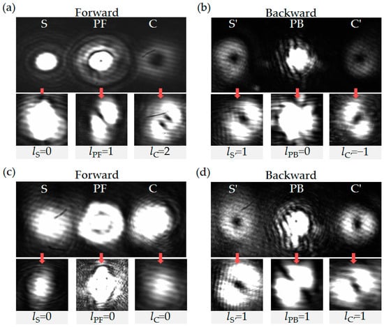 The patterns of the forward and backward output beams when modulating the OAM quantum numbers of the pump beams: (a,b) lPF = 1, and lS = lPB = 0; (c,d) lPB = 1, and lS = lPF = 0. The other parameters are the same as in Figure 4.
