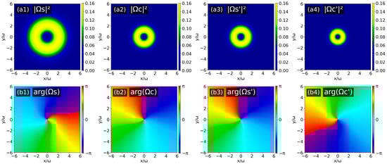 To compare with the three different combinations of input OAM topological charges verified experimentally (the experimental configurations are shown in Figure 4 and Figure 5), we conducted corresponding theoretical simulations and obtained the intensity and phase patterns of the four output optical fields. First, for the first topological charge configuration: lS = 1 and lPF = lPB = 0, Figure 6(a1)–(a4) shows that the intensity distributions of all four output fields exhibit typical annular structures with a phase singularity (dark core) at the center of the ring, indicating they are all vortex beams. The core criterion for the topological charge of OAM can be characterized by the azimuthal evolution of the helical phase distribution: a phase variation of 2π corresponds to a topological charge l = 1 when rotating counterclockwise around the optical axis for a full cycle, whereas a phase variation of −2π corresponds to l = −1 when rotating clockwise for a full cycle. As shown in Figure 6(b1)–(b4), the topological charges of the output S and C′ satisfy: lS = lC′ = 1, and the topological charges of the output fields S′ and C satisfy: lC = lS′ = −1.