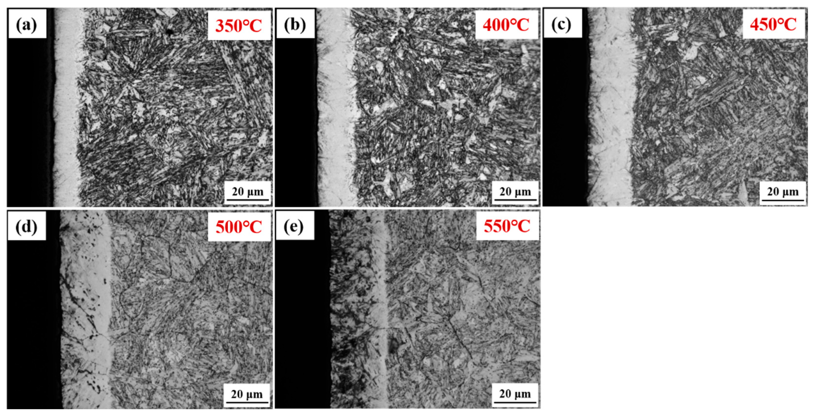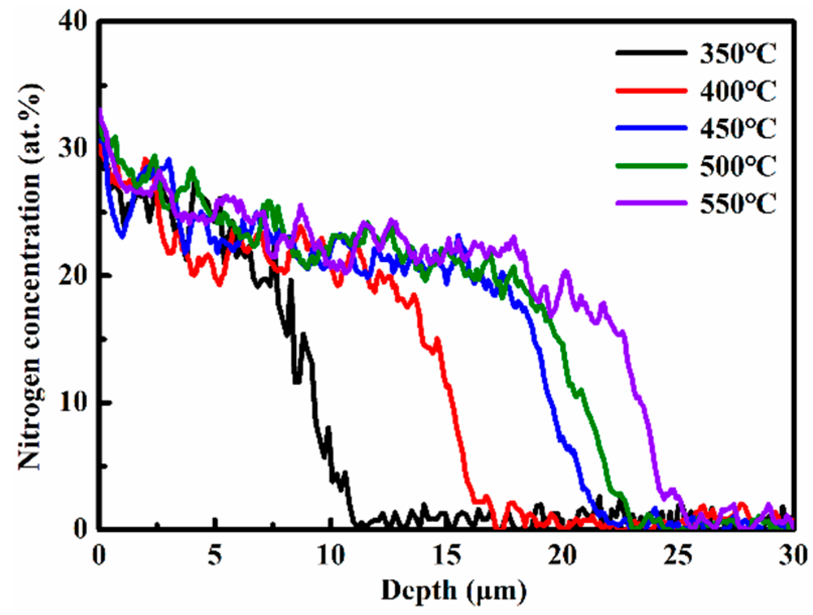 - PBLEII was employed to modify 17-4PH martensitic stainless steel at 350–550 °C for 4 h. A nanocrystalline microstructure forms on the nitrided surface. As the nitriding temperature increased, the layer thickness increased from 11 μm to 27 μm, and the maximum surface nitrogen concentration rose from 29.7% to 33.1%. Concurrently, the nanocrystalline grain size coarsened from approximately 2 nm to 15 nm.