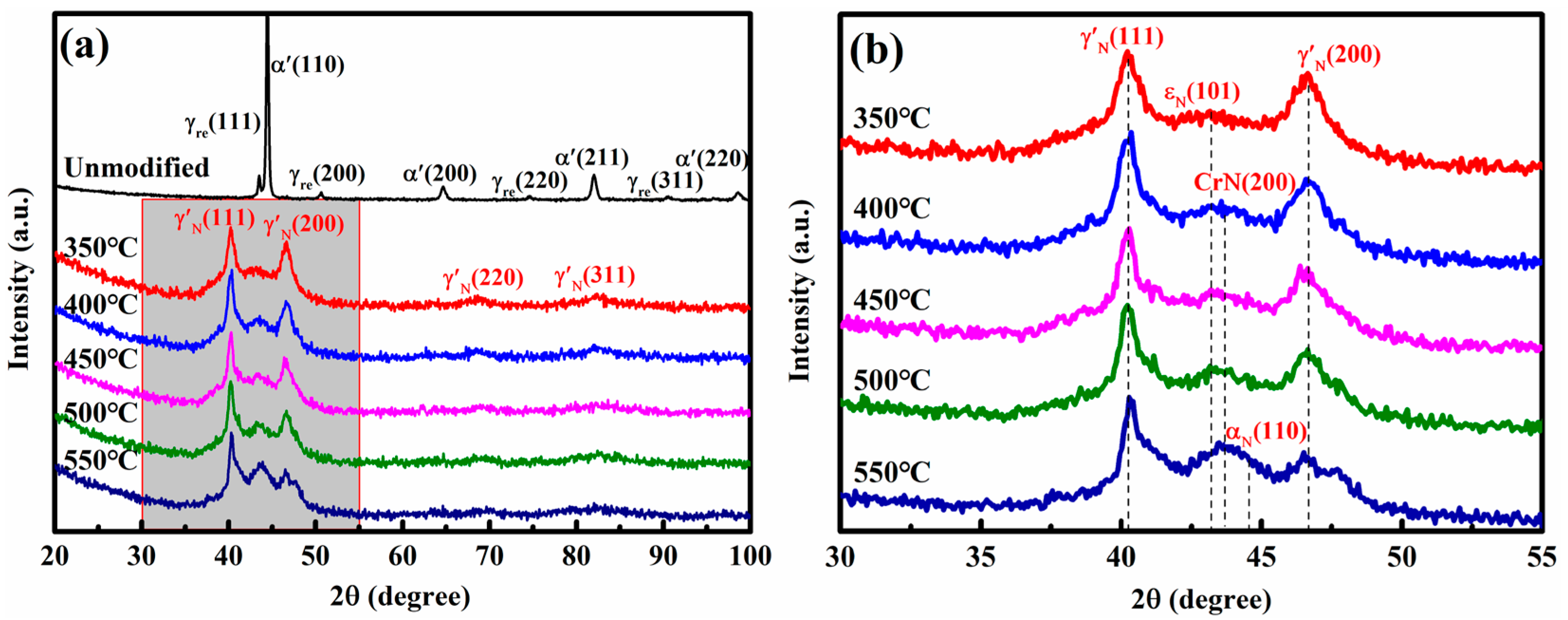 - Liu, R.L.; Yan, F.Y.; Yan, M.F. Surface Grain Nanocrystallization of Fe-Cr-Ni Alloy Steel by Plasma Thermochemical Treatment. Surf. Coat. Technol. 2019, 370, 136–143. [Google Scholar] [CrossRef]