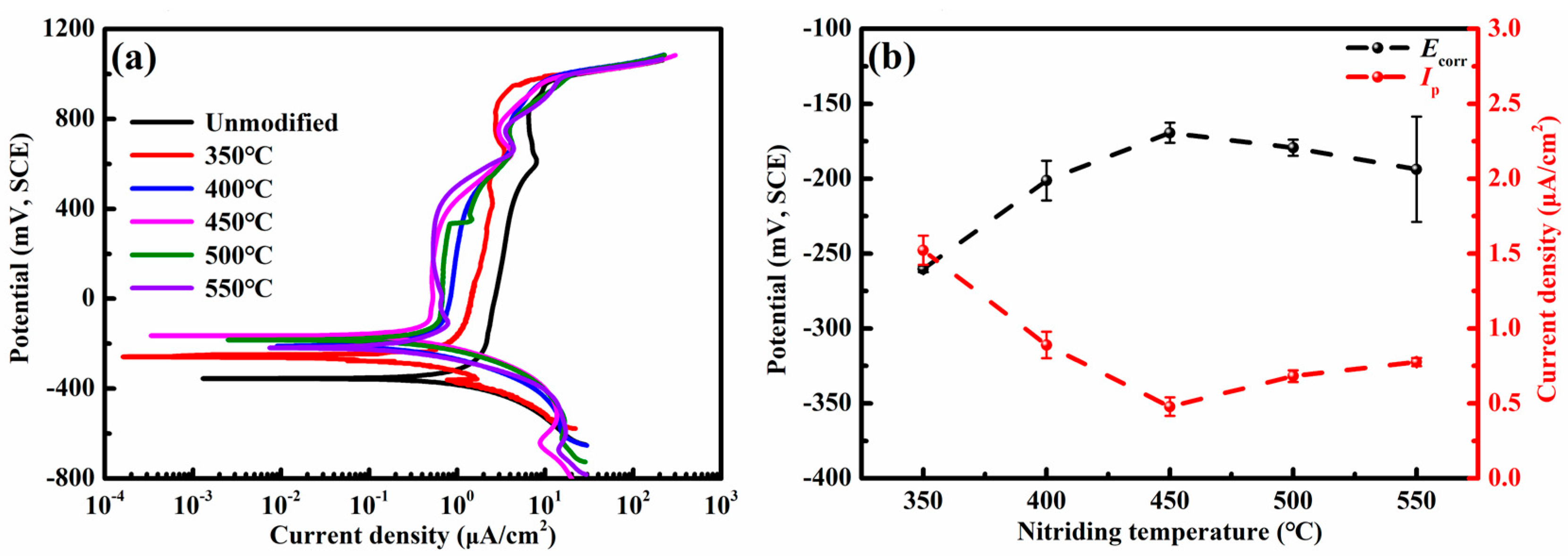 - All nitrided layers exhibit enhanced general corrosion resistance in the pH 8.4 borate buffer aqueous solution compared to the untreated steel. The improvements are primarily attributed to the presence of nanocrystalline γ′N, with minor variations due to CrN precipitation. The optimal corrosion performance is achieved in the nitrided 17-4PH steel at 450 °C, which features nanocrystalline γ′N with 3 nm and minor CrN. This layer exhibits a nobler corrosion potential of −169.4 mV(SCE) and a reduced passivation current density of 0.5 μA·cm−2.