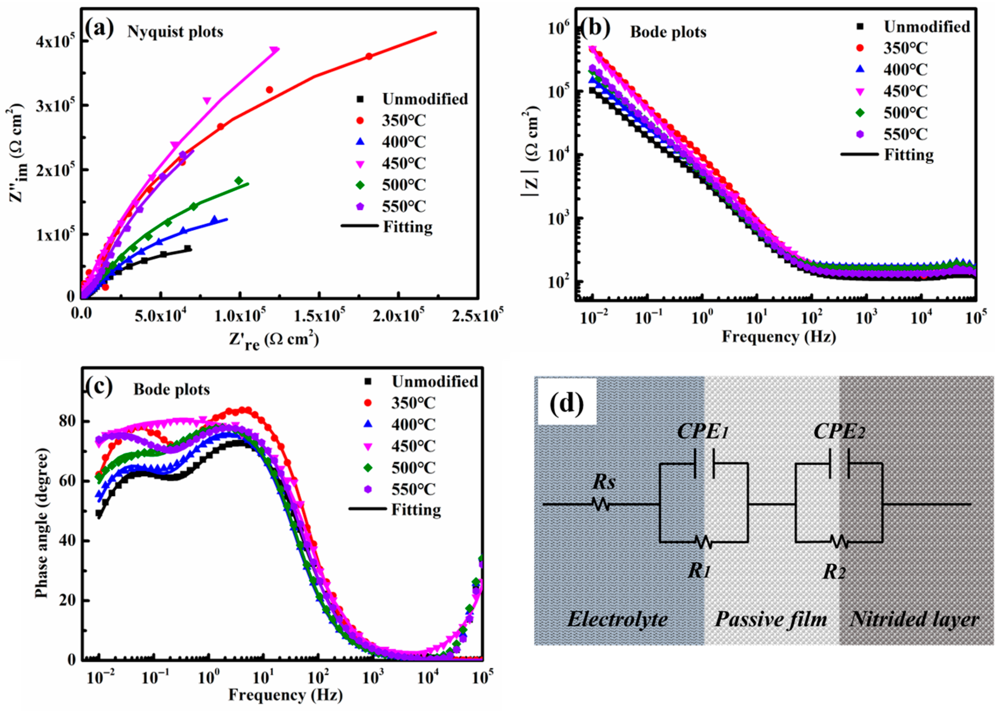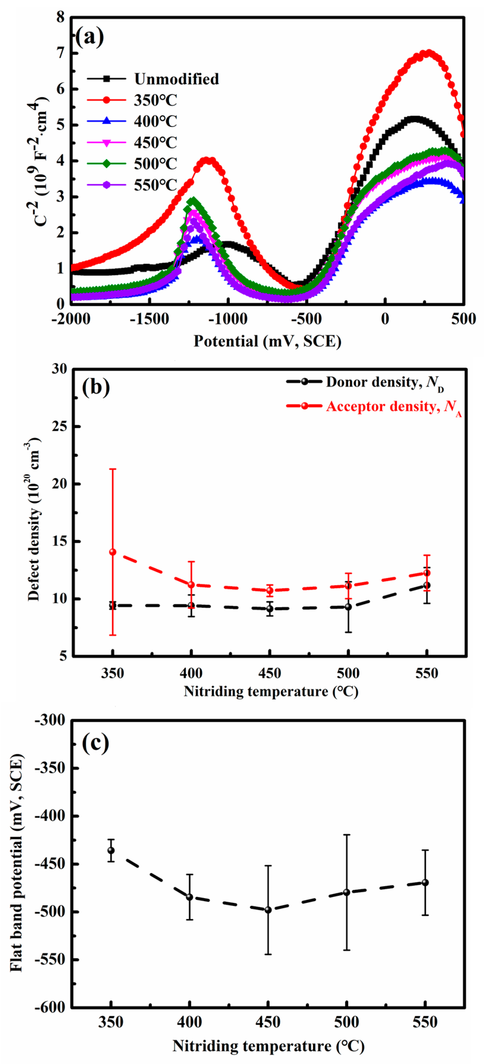 - The point defect model was utilized to elucidate the mechanism underlying the improved corrosion resistance. The high interstitial nitrogen concentration within the nanocrystalline γ′N accelerates passivation kinetics. The nitrided 17-4PH steel at 450 °C forms a particularly dense passive film, characterized by a high polarization resistance (RP) of 4.68 × 105 Ω·cm2 and lower charge carrier densities, acceptor density (NA) of 10.72 × 102 cm−3 and donor density (ND) of 9.14 × 1020 cm−3, which correlates with its superior barrier properties.