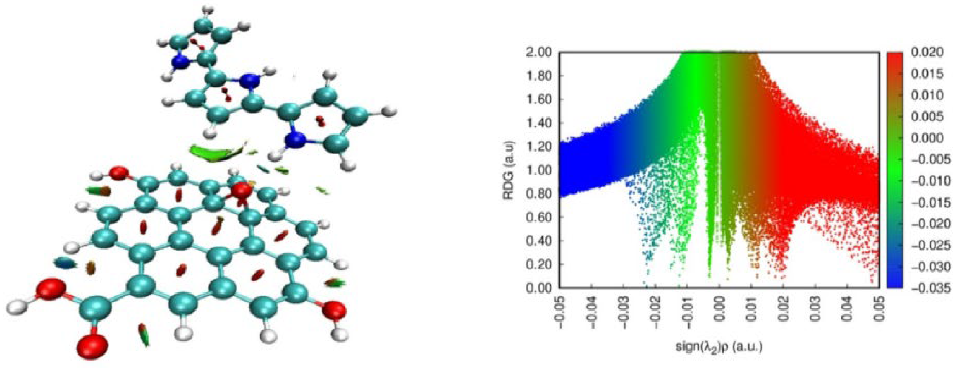 | M06-2X-D3 | 6-31G(d) | PPy on Graphene Oxide (GO3) | Eads | −34 kcal mol−1 | [40] |