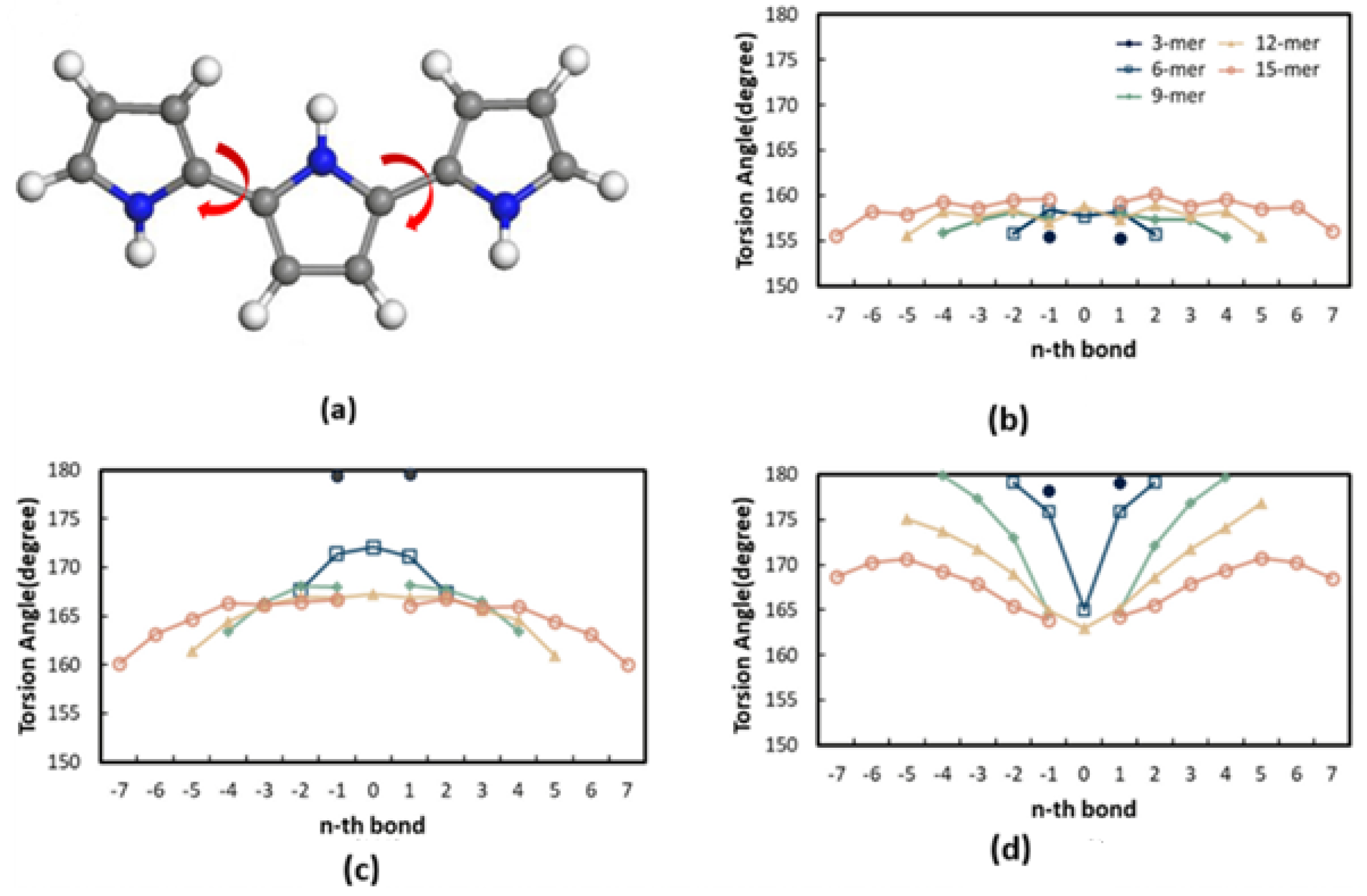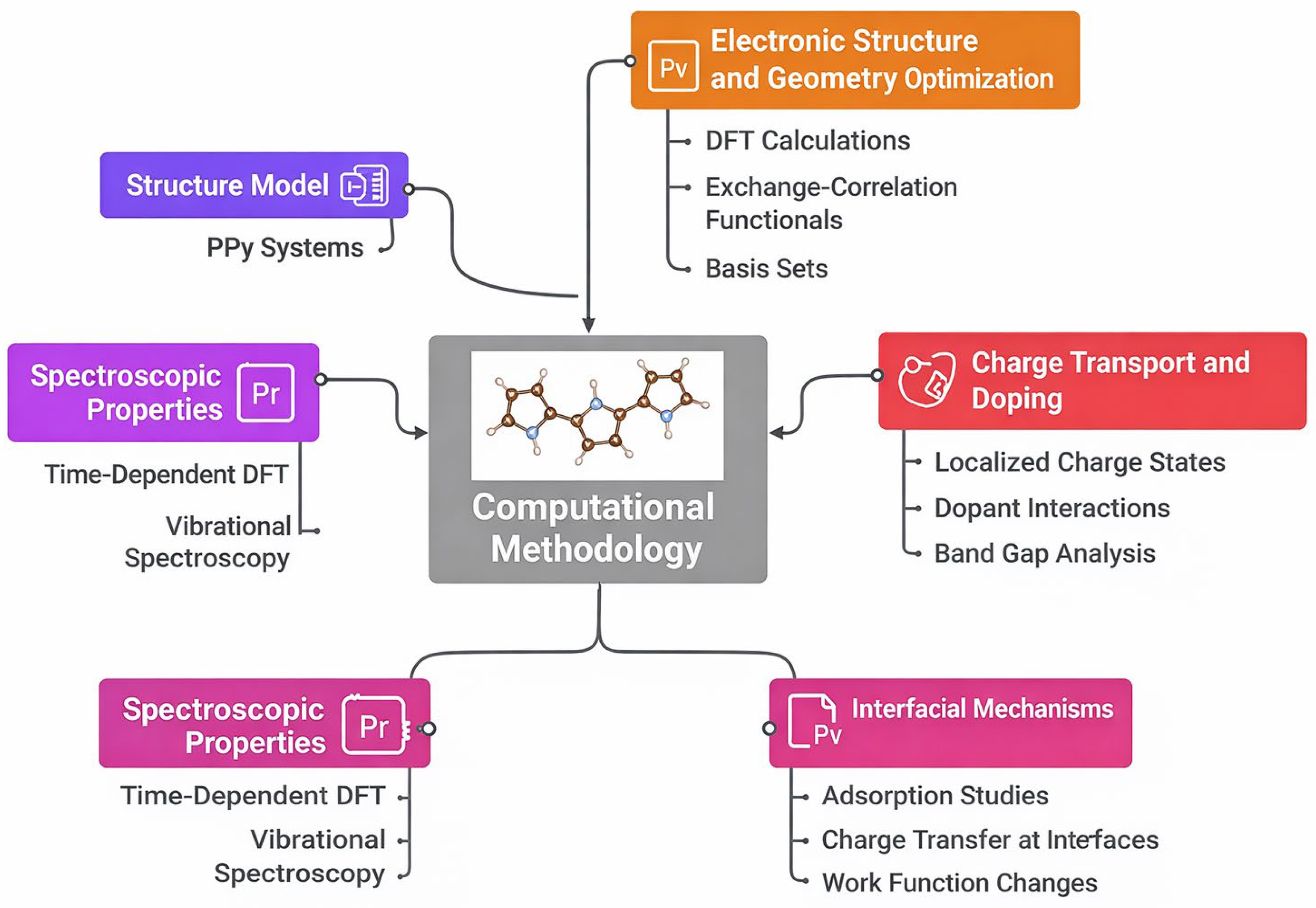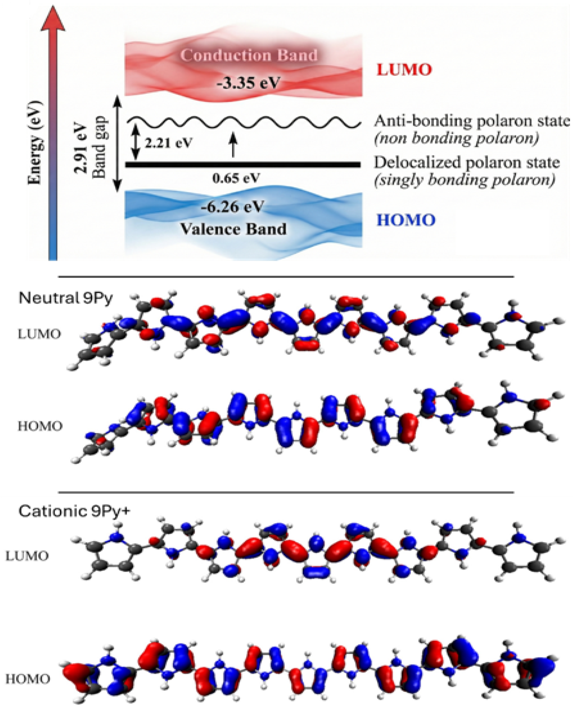 | PPy (Neutral → Cationic) | Eg (UB3LYP/6-31G(d)) | 3.41 → 2.91 eV | Energy Storage | Doping narrows band gap and promotes planar conductive geometry. | [2] |
