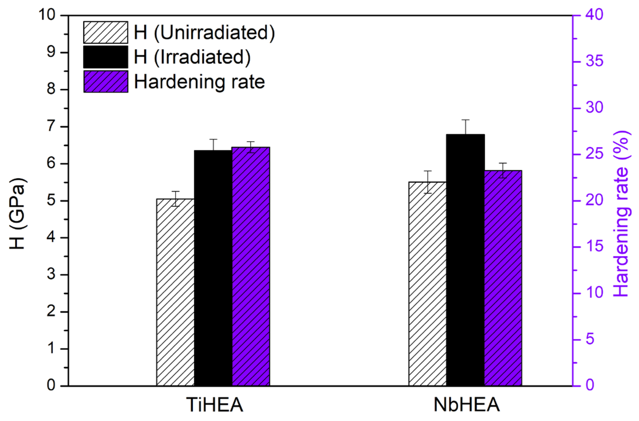 3.6. The Hardness Change After Irradiation in TiHEA and NbHEA