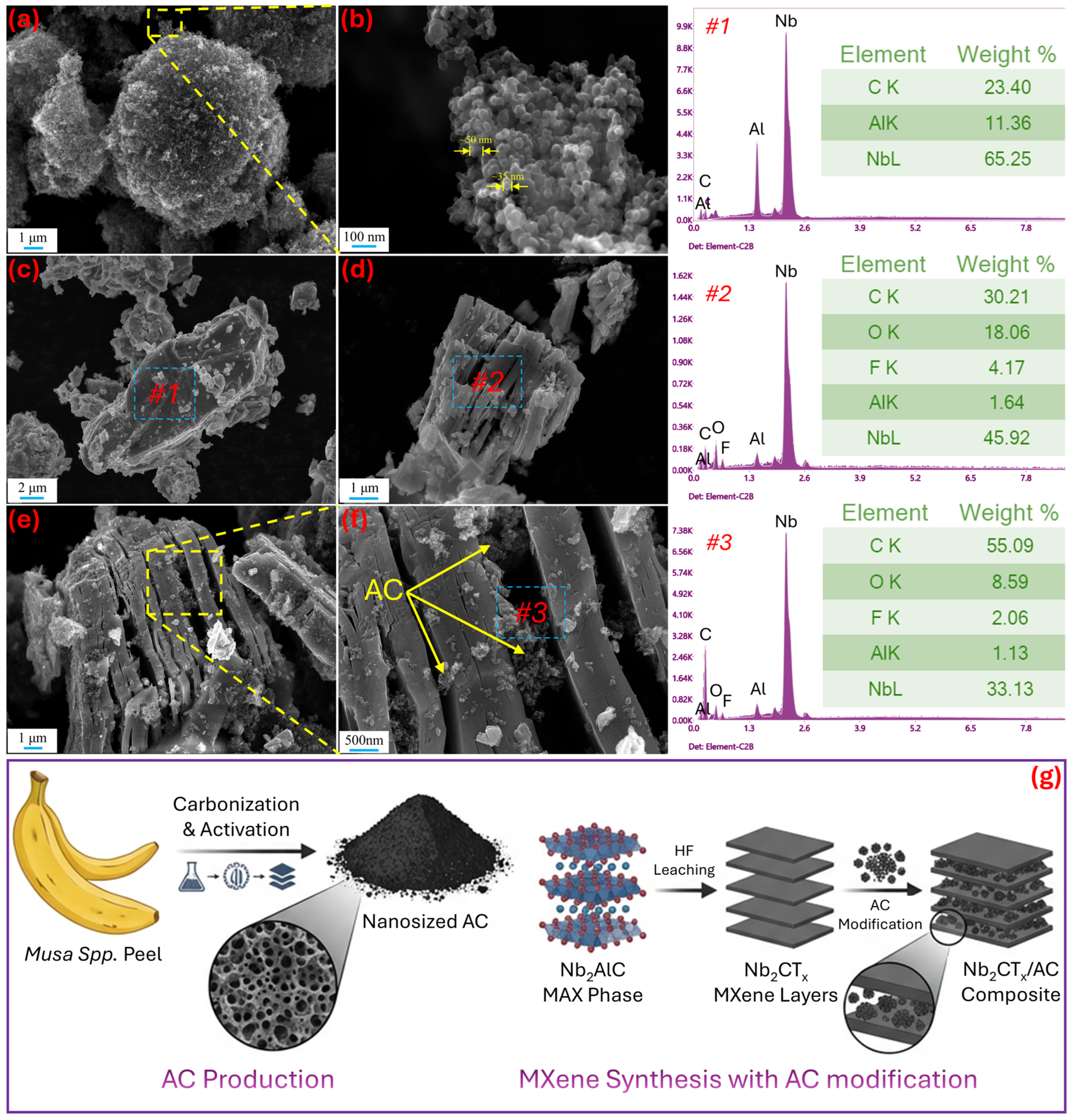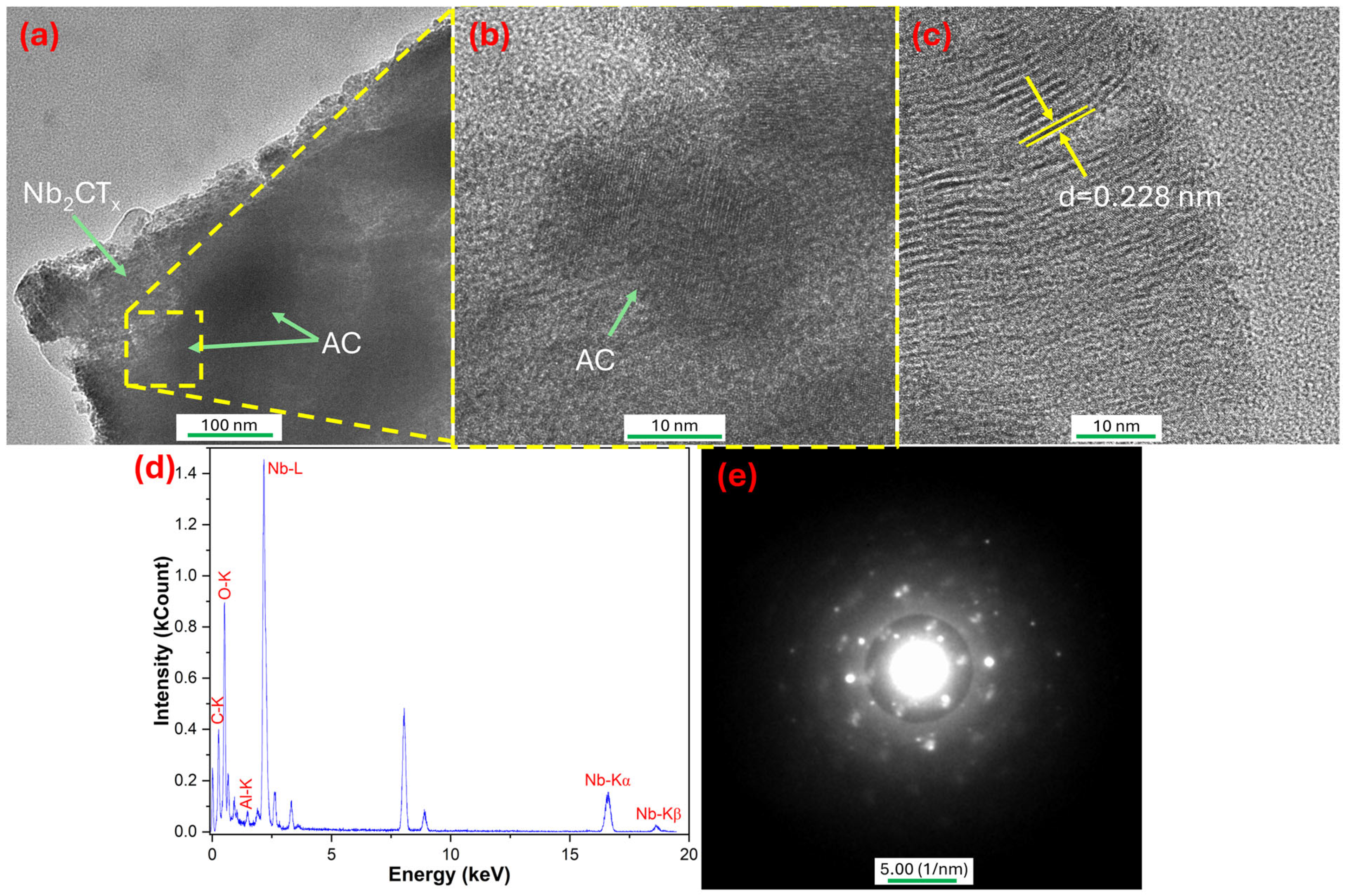 x MXene, which also confirms the presence of AC throughout the structure. Therefore, it indicates that AC was successfully integrated into the MXene structure and could play a role in facilitating electron conduction and ion diffusion by forming a conductive carbon network. It is considered that this morphological and chemical synergy forms the basis of the superior electrochemical performance of the MXAC2 composite electrode. All AC production and Nb