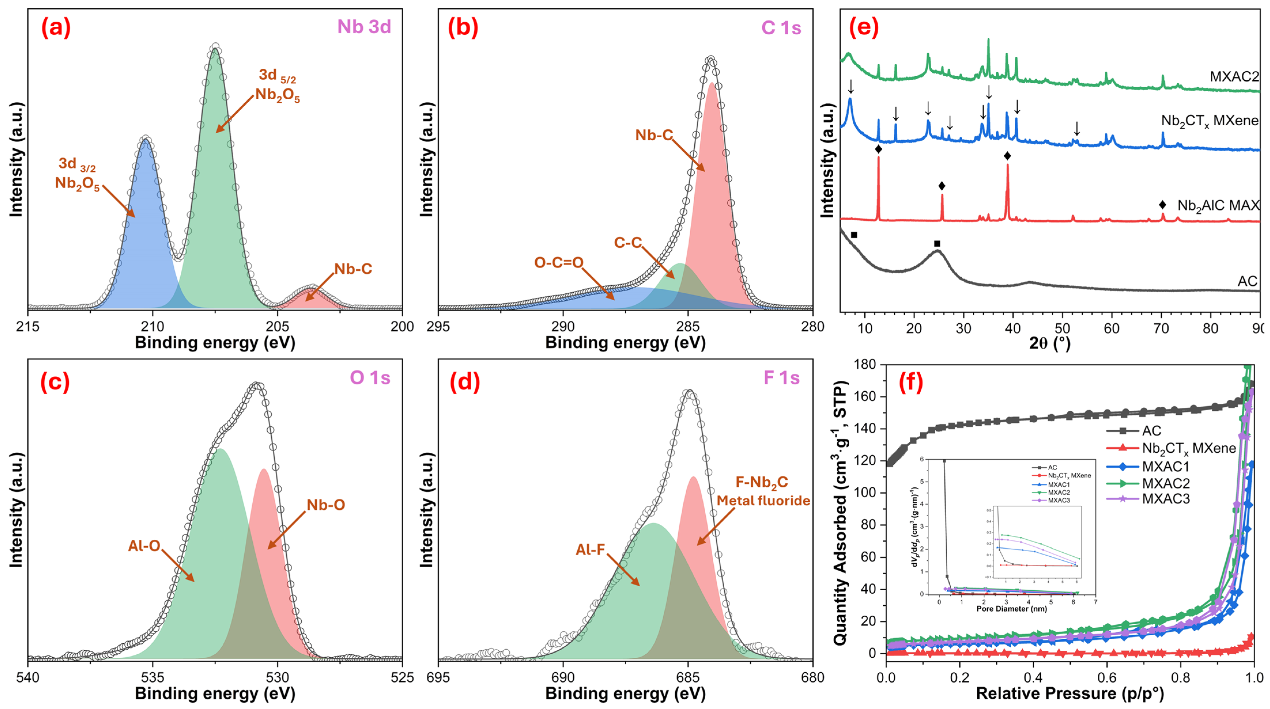 Figure 2, the surface chemistry, crystal structure, and porosity properties of the MXAC2 composite are quantitatively presented using XPS, XRD, and BET analyses. In the high-resolution XPS spectrum of Nb 3d shown in