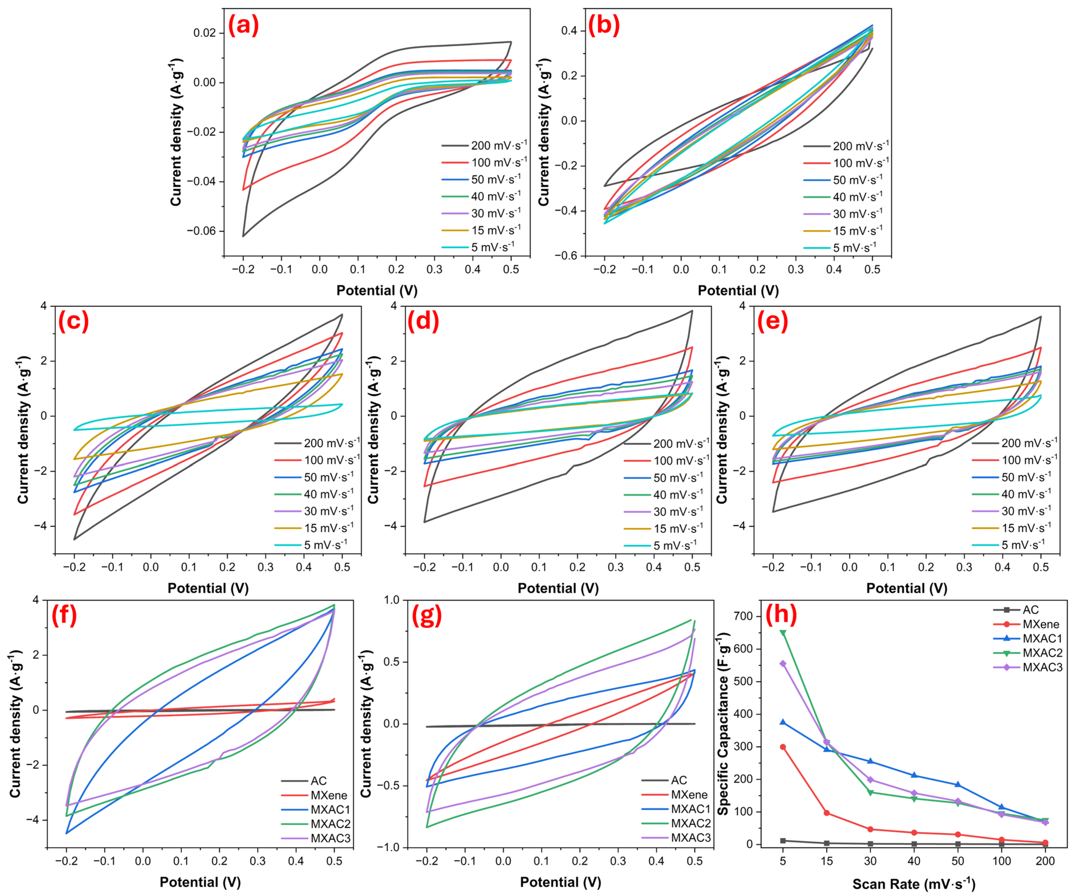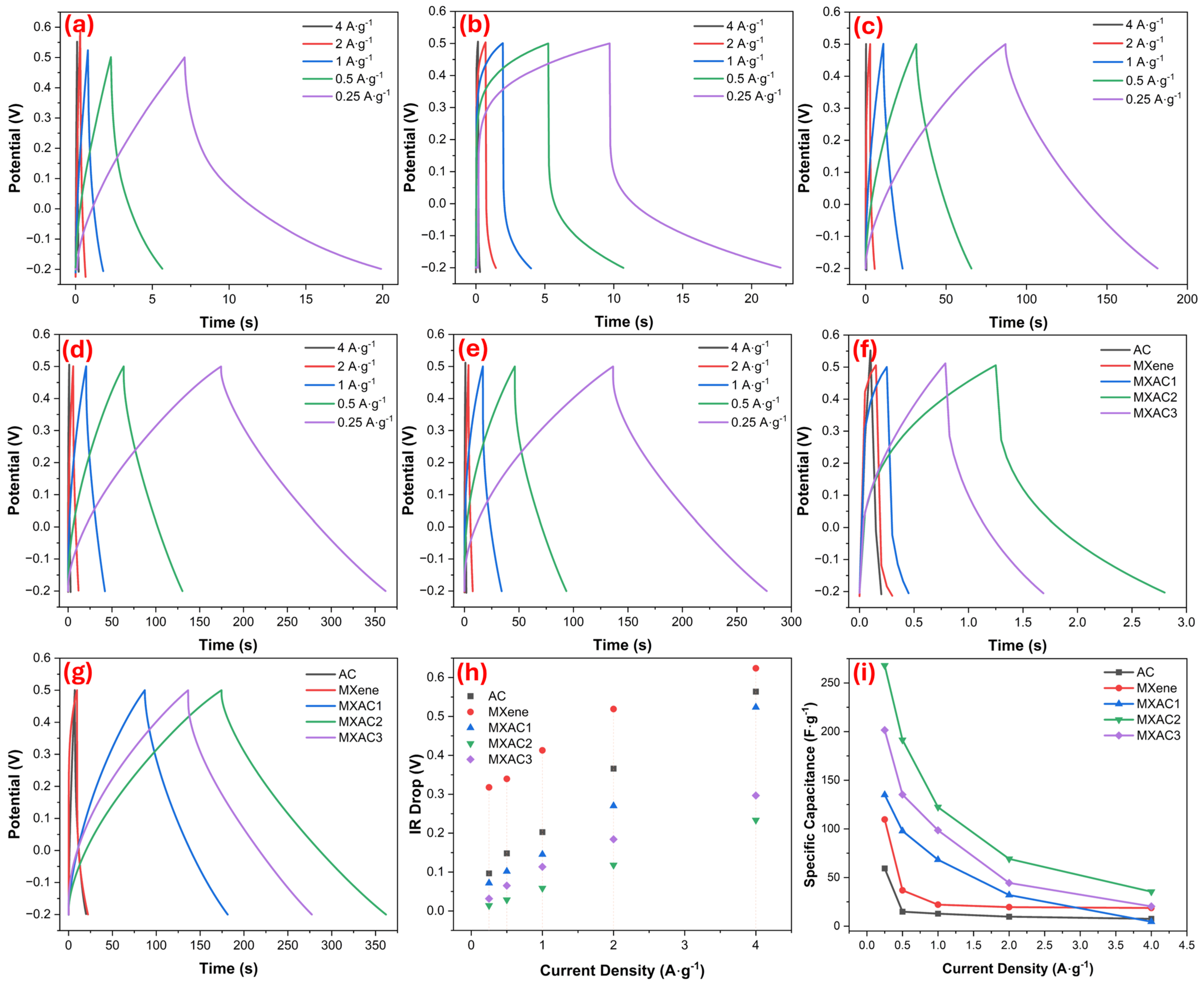 Figure 6a–e show the GCD curves for AC, MXene, MXAC1, MXAC2, and MXAC3, carried out in the range of 0.25–4 A·g