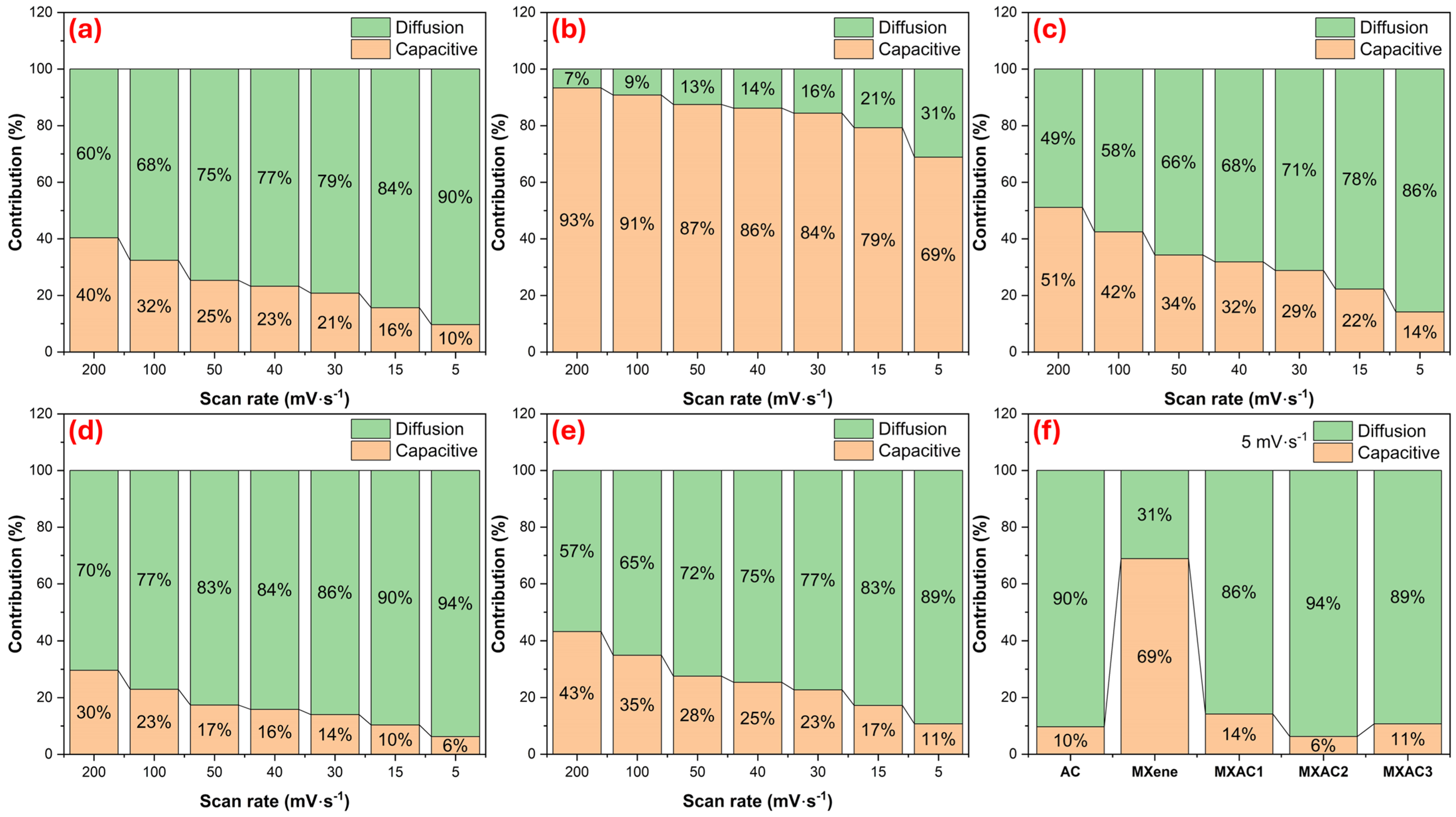 Figure 5d) shows the most pronounced diffusion contribution, reaching 94% at 5 mV·s