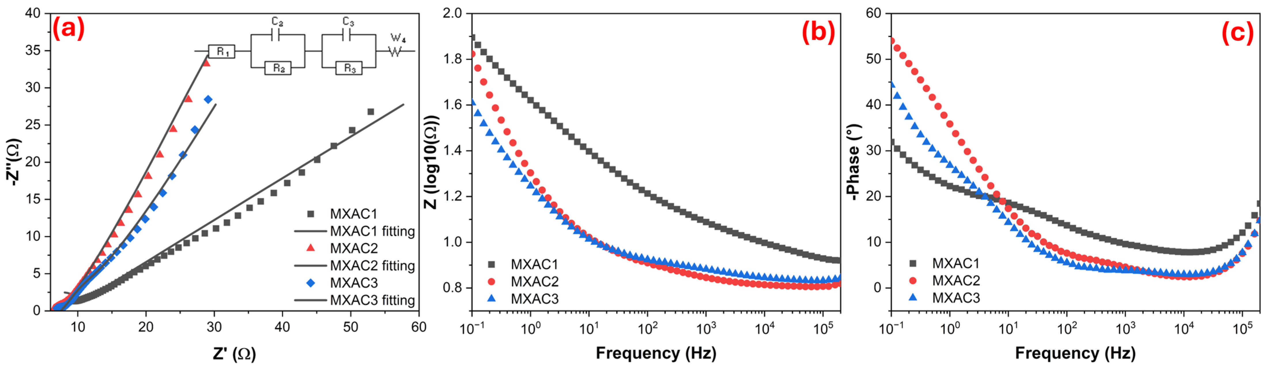 64]. The MXAC2 electrode has a smaller semicircle diameter compared to MXAC1 and MXAC3, which indicates a lower charge transfer resistance. Indeed, the R
