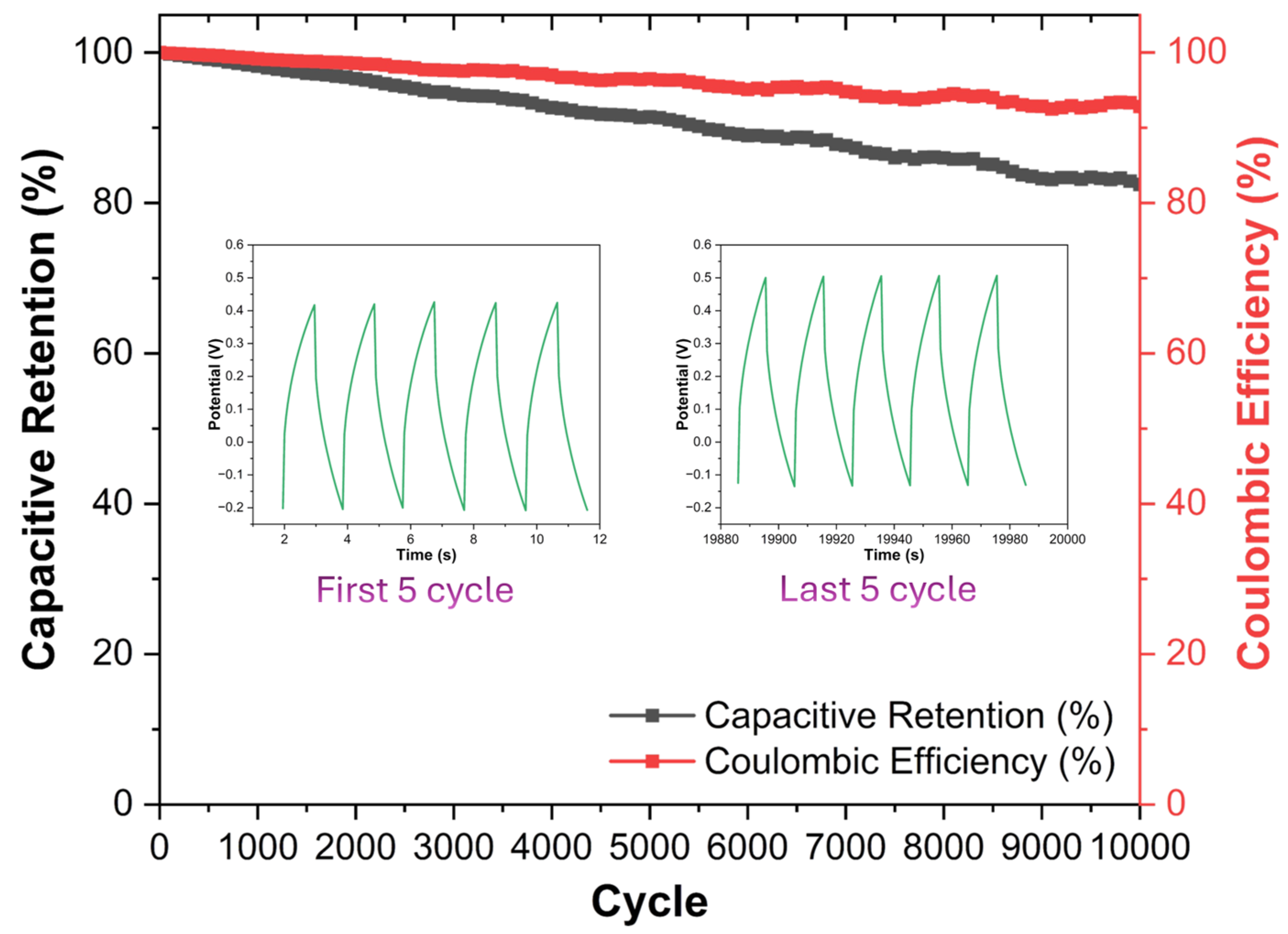 Figure 9 shows the capacitive resistance and coulombic efficiency behavior of the MXAC2 electrode during long-term GCD tests. The MXAC2 electrode exhibited quite high cycle stability, demonstrating 82.15% capacity retention after 10,000 cycles. The coulombic efficiency remains constant at 92.45% throughout all cycles, indicating that the charging and discharging processes occur with high reversibility and that there is no significant degradation in the electrode structure [