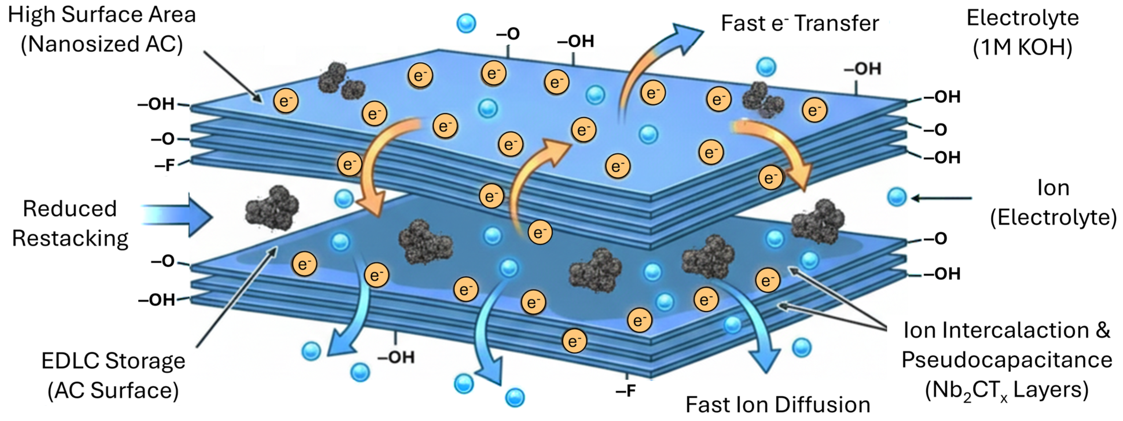 11]. The incorporation of AC between MXene layers not only physically prevents restacking but also enhances electrolyte ion diffusion and improves EDLC performance. Consequently, MXene–AC hybrid electrodes exhibit enhanced electrical conductivity, improved pseudocapacitive behavior, and superior cycling stability compared to pristine MXene electrodes [
