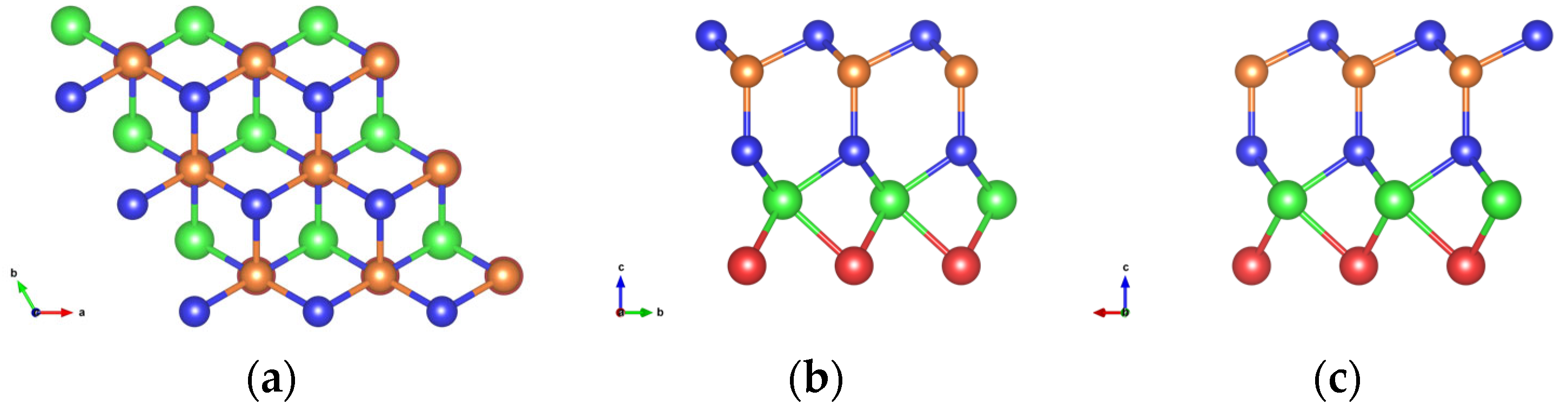 - Freitas, R.R.Q.; De Brito Mota, F.; Rivelino, R.; De Castilho, C.M.C.; Kakanakova-Georgieva, A.; Gueorguiev, G.K. Spin-Orbit-Induced Gap Modification in Buckled Honeycomb XBi and XBi3 (X = B, Al, Ga, and In) Sheets. J. Phys. Condens. Matter 2015, 27, 485306. [Google Scholar] [CrossRef]