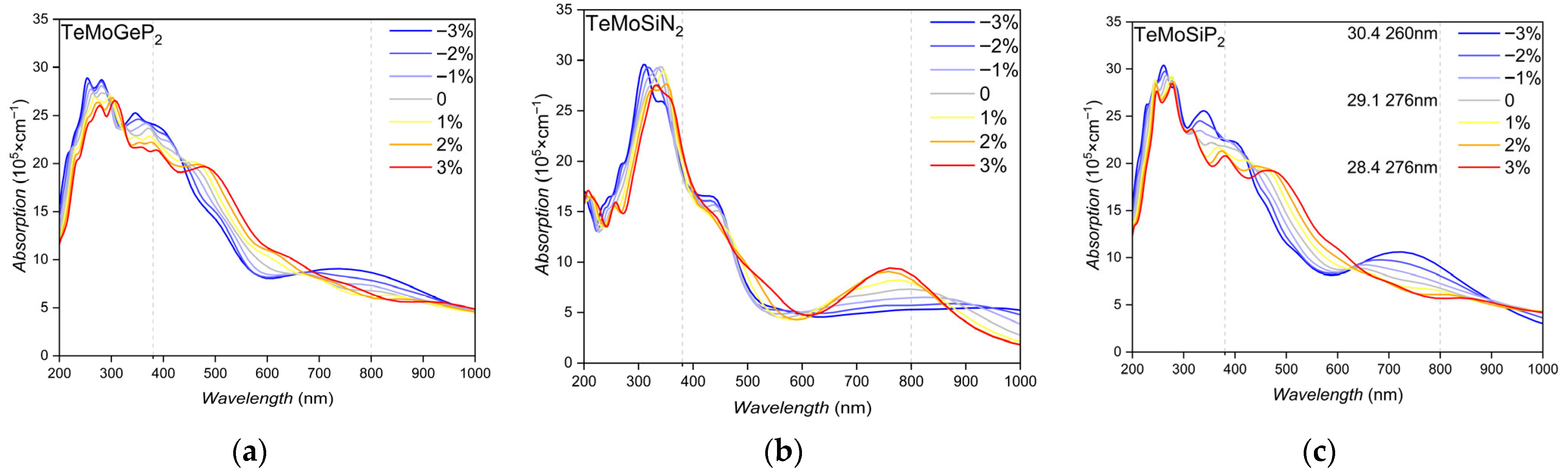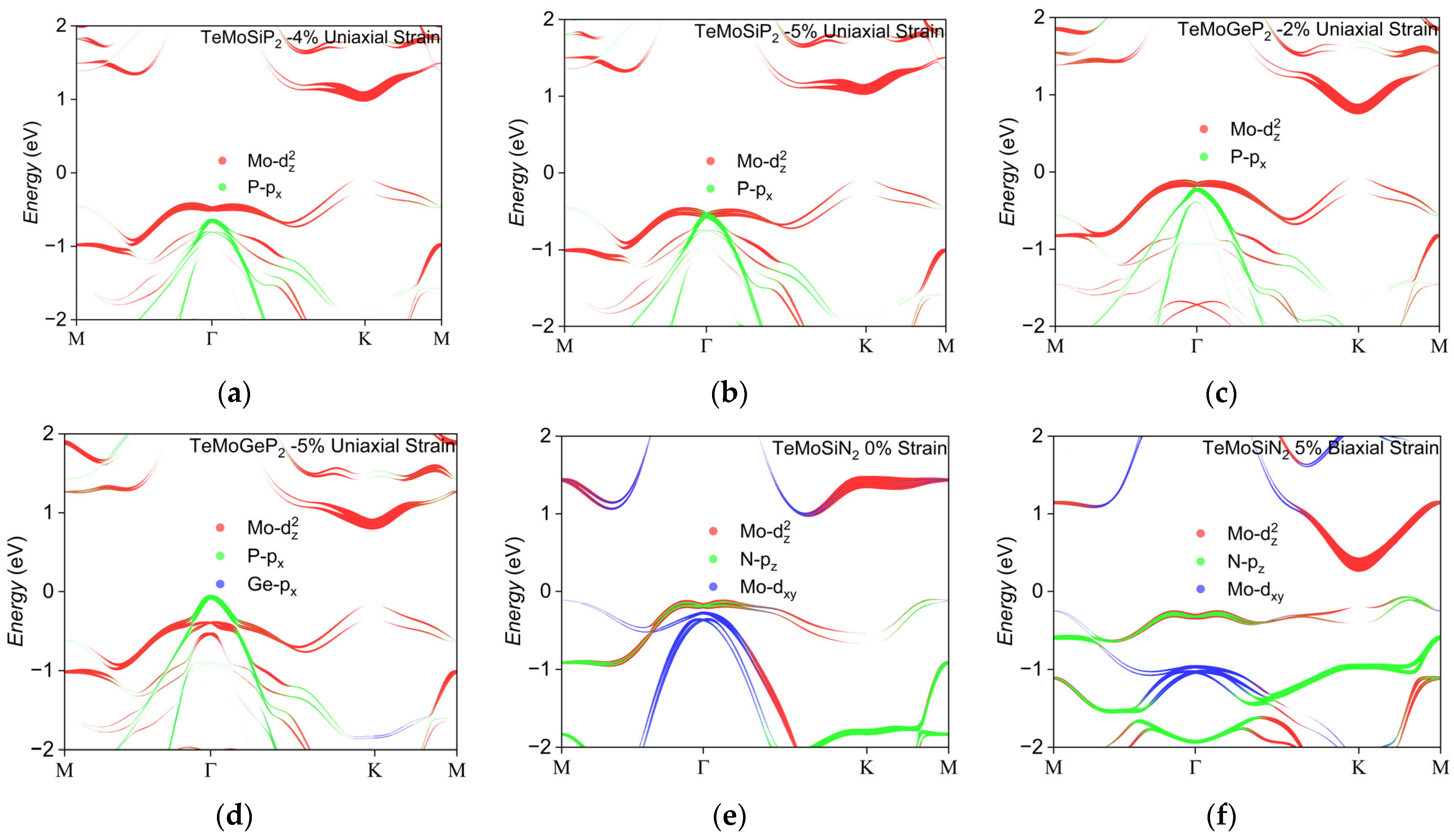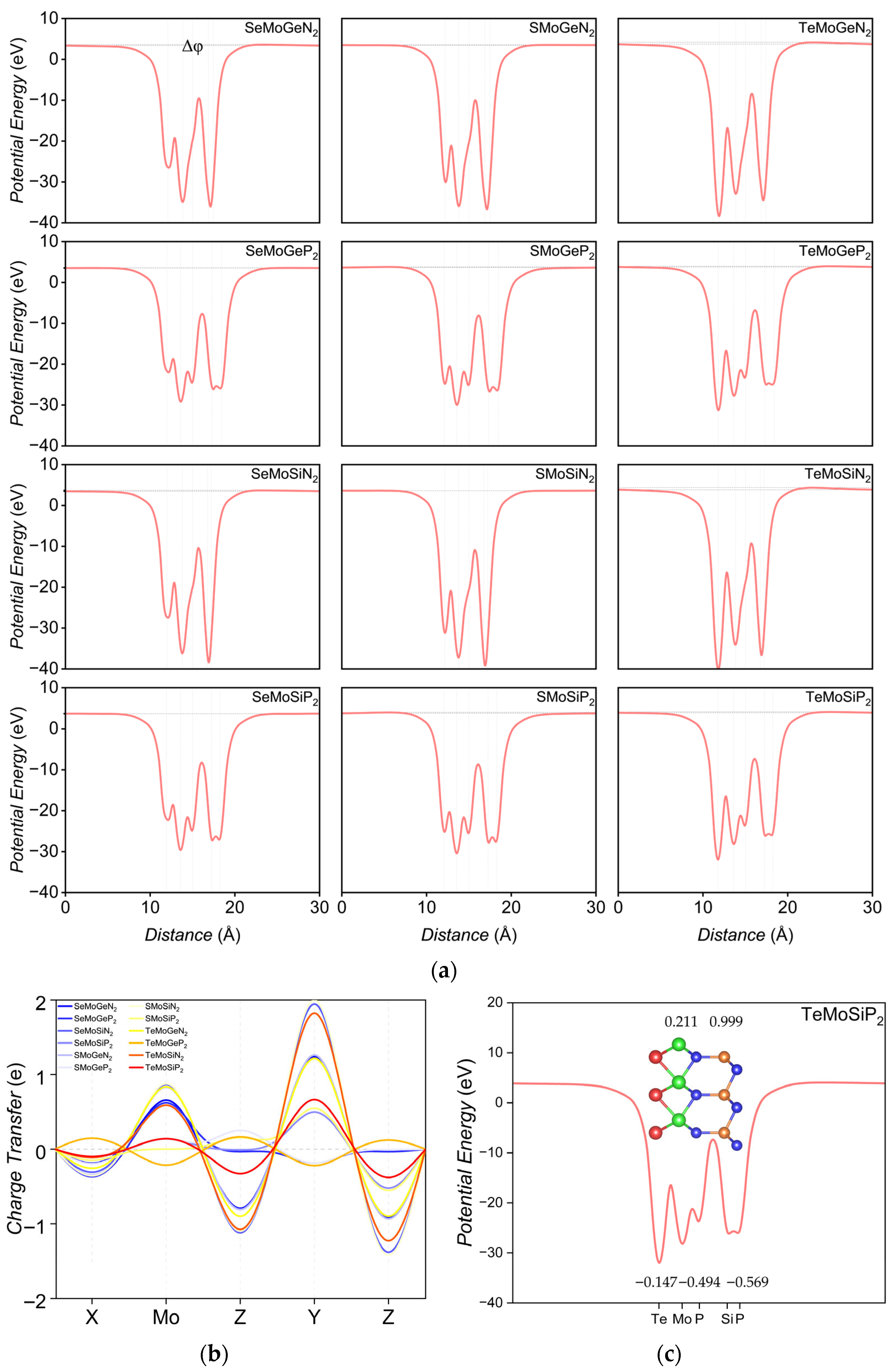 - Sibatov, R.T.; Meftakhutdinov, R.M.; Kochaev, A.I. Asymmetric XMoSiN2 (X = S, Se, Te) Monolayers as Novel Promising 2D Materials for Nanoelectronics and Photovoltaics. Appl. Surf. Sci. 2022, 585, 152465. [Google Scholar] [CrossRef]