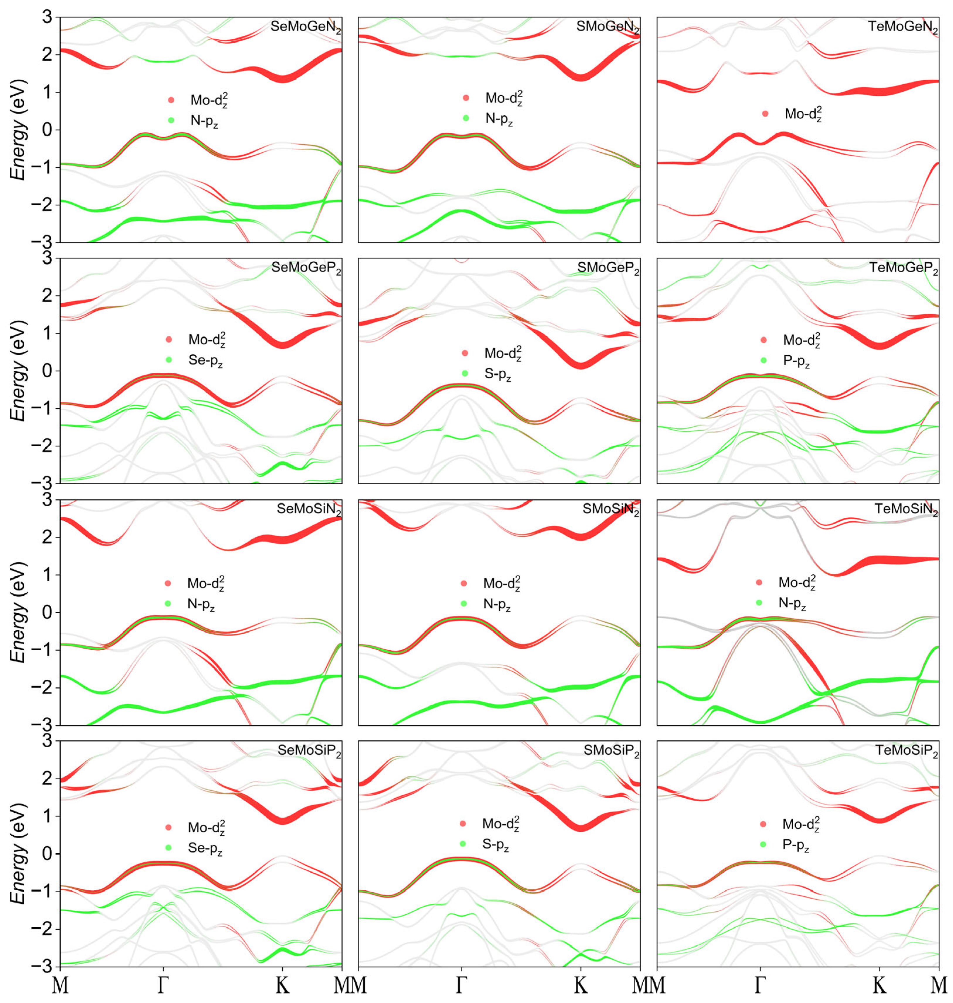- Zamanian, E.; Babaee Touski, S. Electronic, Rashba and Photocatalytic Properties of Janus XMoYZ2 (X = S, Se, Te; Y = Si, Ge and Z = N, P) Monolayers. Physica E 2024, 163, 116012. [Google Scholar] [CrossRef]