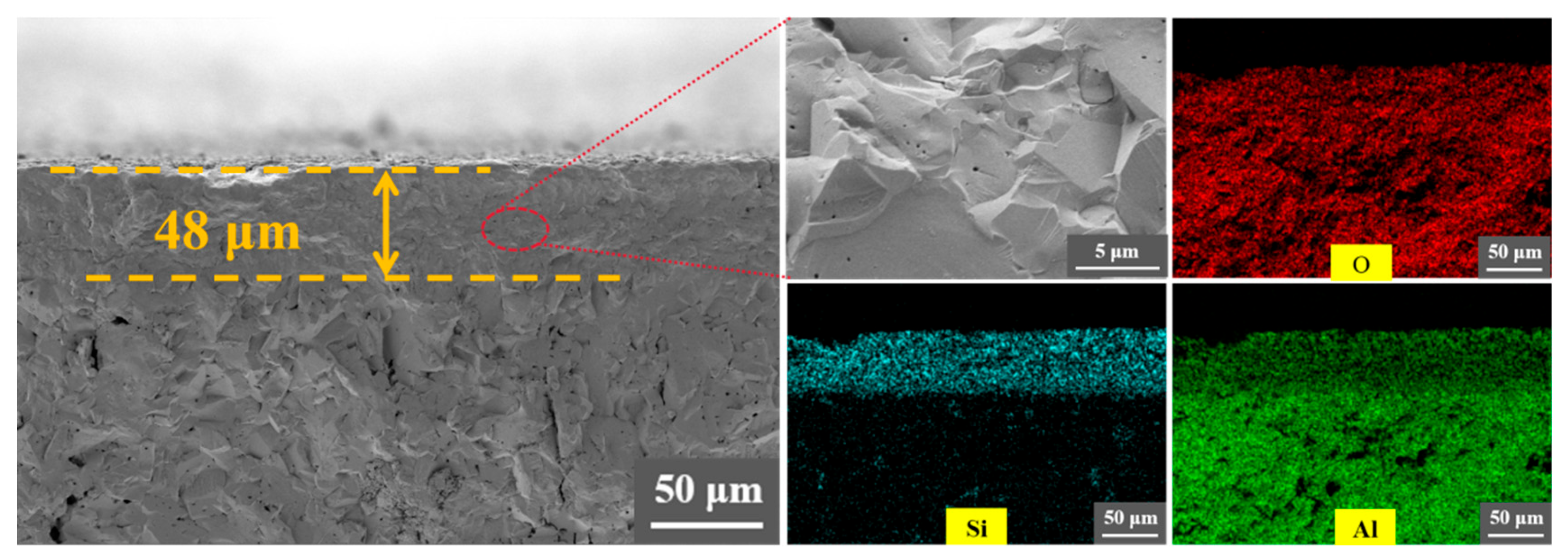 - Cao, D.; Lv, K.; Bao, Y.; Tian, Y.; Wan, D. Thickness effect of an alumina–zirconia–mullite composite coating on the properties of zirconia. RSC Adv. 2023, 13, 2736–2744. [Google Scholar] [CrossRef]