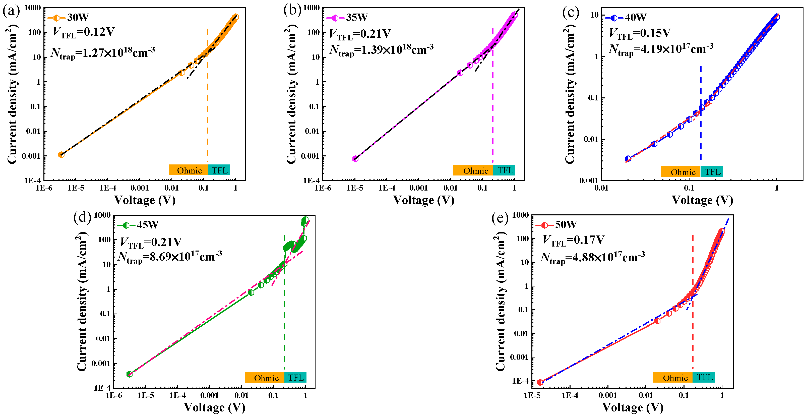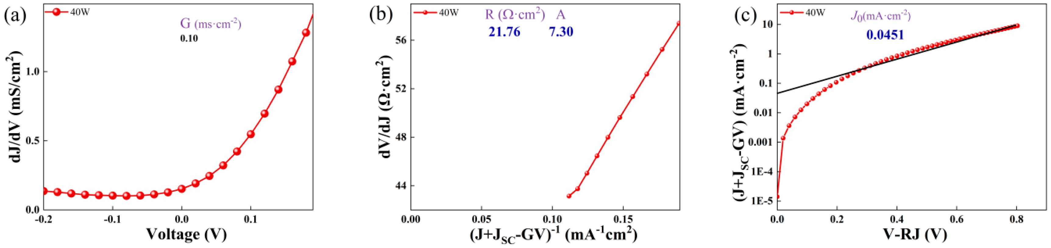 | Sputtering Power (W) | G (mS·cm−2) | (mA·cm−2) | R (Ω·cm2) | A |