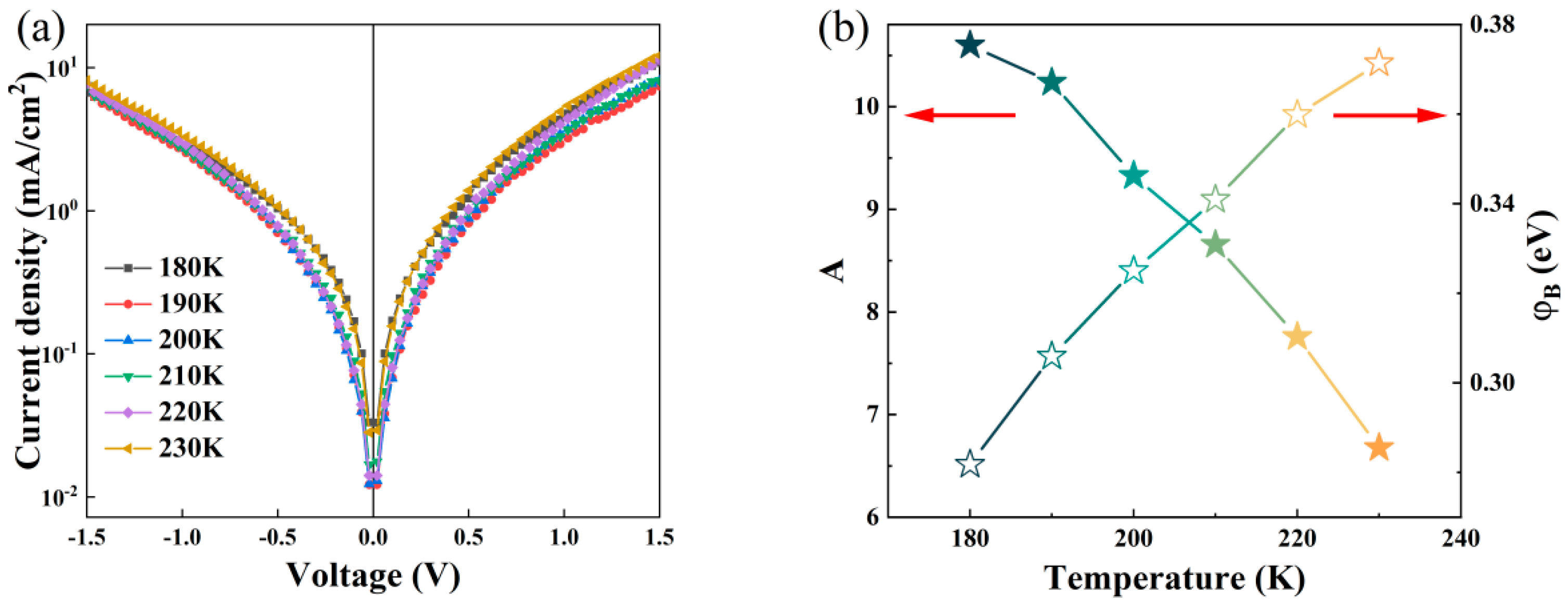 - Ye, F.; Zhao, Z.; He, C.; Liang, J.; Gao, Q.; Xie, Y.; Zhang, D.; Cai, X. Capacitance Characterization and Current Transport Mechanism of ZnSnN2 Heterojunctions. Appl. Phys. Lett. 2024, 125, 242102. [Google Scholar] [CrossRef]