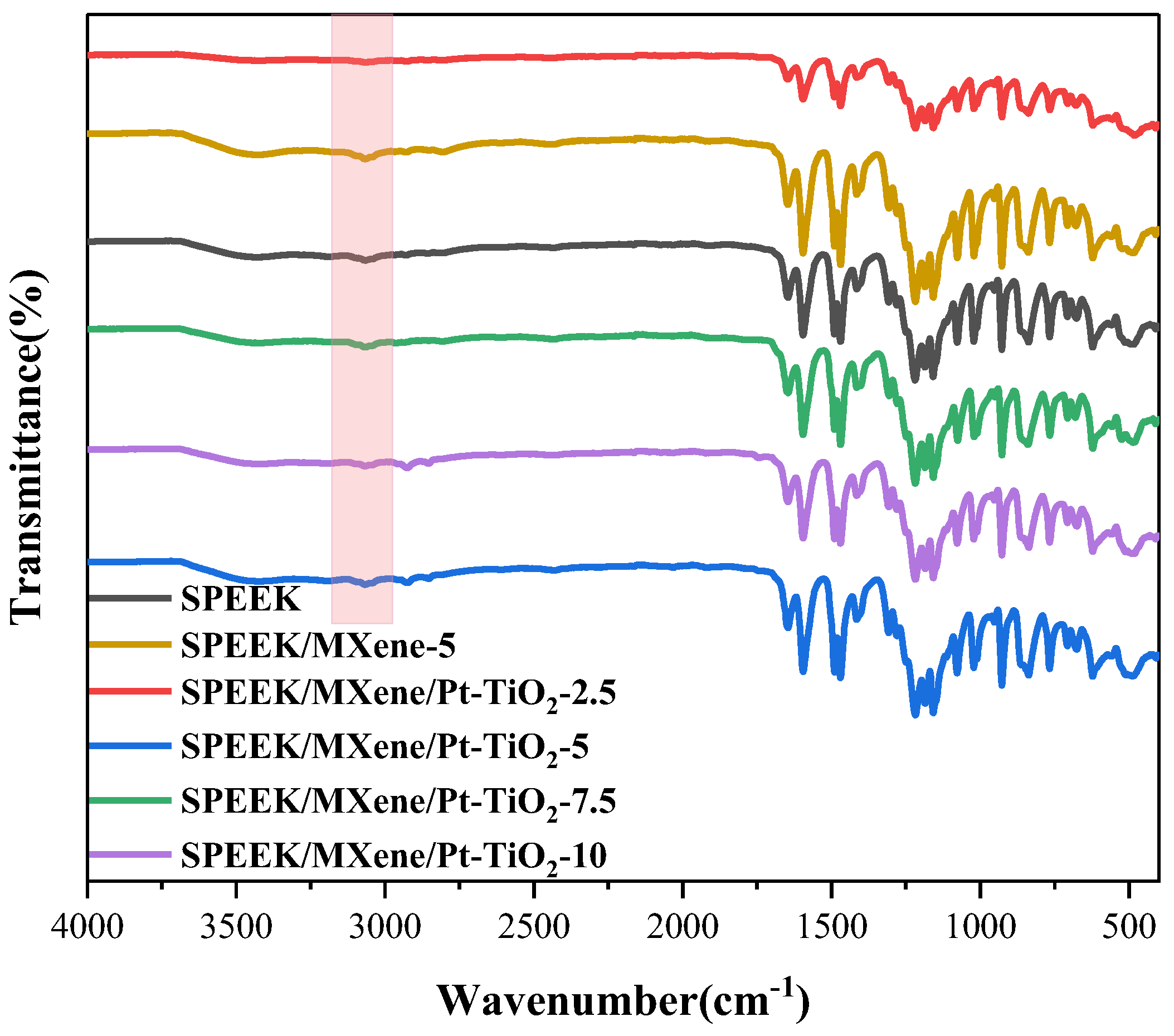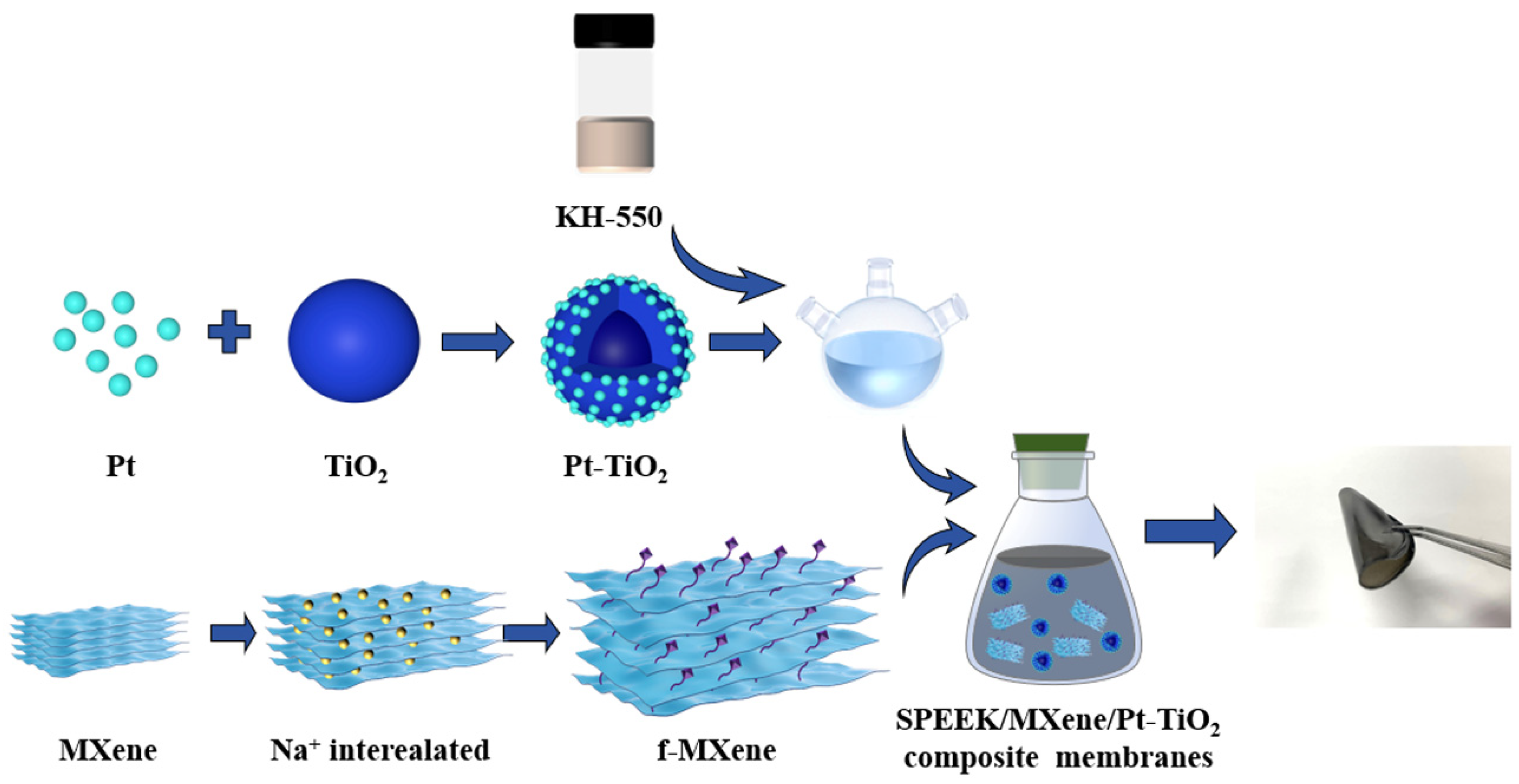 2.5. Preparation of SPEEK/MXene/Pt-TiO2 Composite PEM